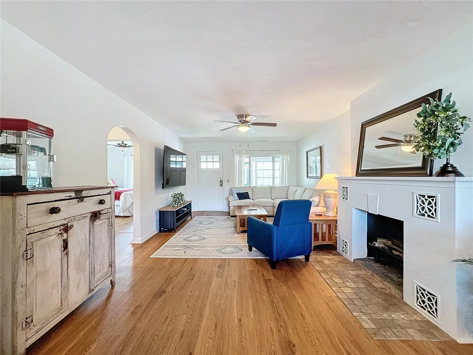 Step into the spacious enclosed porch, ideal for a home office. The roomy living room features elegant arches and stylish wood-look flooring that flows throughout the home, complemented by a cozy wood-burning fireplace for chilly evenings. The sunny dining room, with its large windows overlooking the backyard, is perfect for family meals and entertaining. The updated kitchen, which opens to the dining room, boasts white shaker cabinets, quartz countertops, and stainless-steel appliances.
