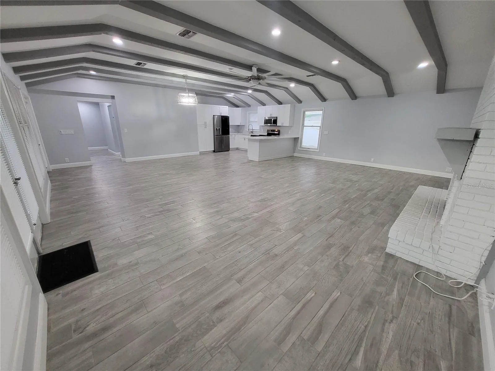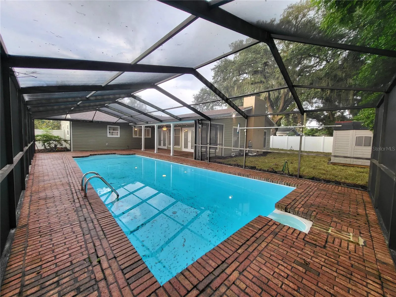 THIS IS THE ONE! NEW ROOF IN 2023! NO CARPET! HUGE POOL! NO HOA! This beautifully UPGRADED & UPDATED (2023) 4 bed, 2 bath, POOL home with FULLY FENCED BACK YARD needs a new family! Arriving to this MOVE-IN READY home you’ll notice it is covered with easy care vinyl siding and accented with a warm red brick detail. Clean landscaping, a light post and a solar lighted brick pathway lead up to the front entry that welcomes you into a SPACIOUS FOYER with room for a bench, hutch or other entry way storage piece. You’re sure to love the durable WOOD PLANK TILE FLOORING that runs seamlessly throughout this entire home. Once inside, follow the main hallway to the bedrooms to the right or around the corner to the HUGE OPEN GREAT ROOM that features the KITCHEN, LIVING & DINING areas and boasts HIGH CEILINGS with WOOD BEAMS that stretch the width of this impressive space. The large BRICK FIREPLACE featuring a REMOTE-CONTROLLED LIGHT & ELECTRIC FLAME (can produce heat too!) is the focal part of this grand room. The well-appointed, OPEN KITCHEN is equipped with STAINLESS STEEL APPLIANCES including a LG ThinQ glass top range with convection oven and a refrigerator with glass panel door + side by side freezer that has a door dispenser with ice cubes/water as well as a secondary, beverage lover’s dream, ICE BALL MAKER! Neutral GRANITE COUNTERTOPS & white Shaker style cabinets allow for your favorite pop of color. Enjoy natural lighting from the window above the kitchen sink. There is also a tall CABINET STYLE PANTRY as well as BAR SEATING for four. Enjoy views of the backyard, POOL & PATIO from the kitchen, living & dining areas through the numerous windows as well as two sets of French Doors. A FULL BATH with WALK IN SHOWER, situated behind a BARN DOOR is conveniently located adjacent to the great room. The inside LAUNDRY area comes complete with a FULL-SIZE WASHER & DRYER and has ample storage with two shaker style cabinets. FOUR BEDROOMS and a FULL BATH are situated opposite the great room. The bathroom, adorned with a convenient sliding BARN DOOR features a DUAL VANITY with granite counters, cabinet & drawer storage plus a tub/shower combo & sleek dual flush toilet. The spacious Primary bedroom offers views of the pool and has two built in closets. All bedrooms feature ceiling fans with lights. Rounding out the inside is a MUDROOM off the covered CARPORT that also has a door to the fenced backyard that features NEW SOD and has a LARGE SHED for storing your lawn equipment, bikes and more. The oversized NEWLY RESCREENED LANAI features a 540sf POOL that is great for swimming laps or relaxing on your raft or oversized floaty! You’re sure to love this beautiful home so don’t wait, call today! Even the CARPORT is pretty with its wood plank ceiling! Newer dual pane windows. Conveniently located close to downtown, shopping, restaurants and more. Seller will consider buyer concessions with acceptable offer. Can close quickly.
