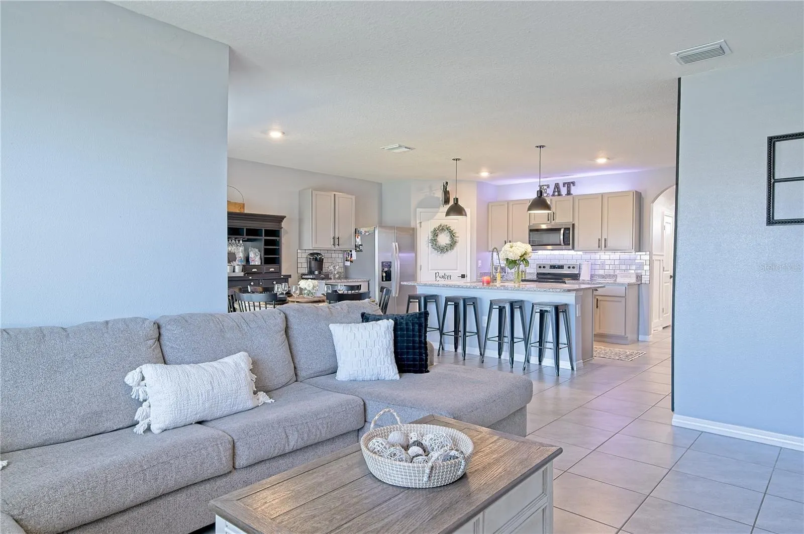 As you step inside, you’re greeted by architectural details unusual in a builder development, including beautiful board and batten trimmed walls lit by sparkly chandeliers above, leading to the dramatic accent wall in the family/kitchen area. Cozy up by the modern special-effects fireplace, complete with floating shelves, perfect for displaying your cherished belongings.