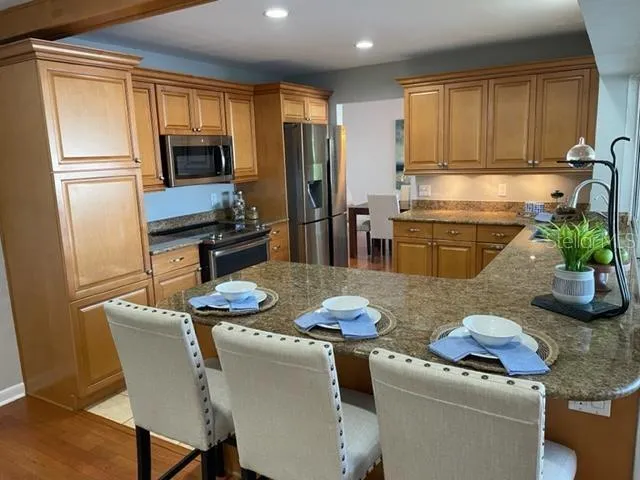 Spectacular waterfront views abound from this house with a pool that looks directly down the canal and brand new seawall! The split floor plan with 4 bedroom, 2 baths and a 2 car garage has 5 sliders across the back of the house giving easy viewing access to the visiting dolphins and manatees. Master suite includes walk-in closet, his/her sinks, granite countertops, and an oversized shower that is also a steam room with a granite bench to relax and wind down. Kitchen has been updated with newer cabinets, granite, stainless appliances, glass-top range, etc. Dock has an electrical outlet, but property owner planning to keep his boat there. Large open pool with covered paver patio to enjoy those beautiful Florida days. Other features include a PVC fended back yard, plantation window shutters, updated fixtures, spacious living room, hurricane shutters, and much more. Located just minutes from the Vinoy and Beach Drive, you can easily take advantage of all the conveniences of downtown St. Pete and 4th Street while enjoying the benefits of a private waterfront home in Ponderosa Shores. Massive front yard offers plenty of privacy and a driveway deep enough to easily accommodate 6 vehicles. Property is neutrally decorated and shows well. Landlord will cover cost of pool and yard maintenance.