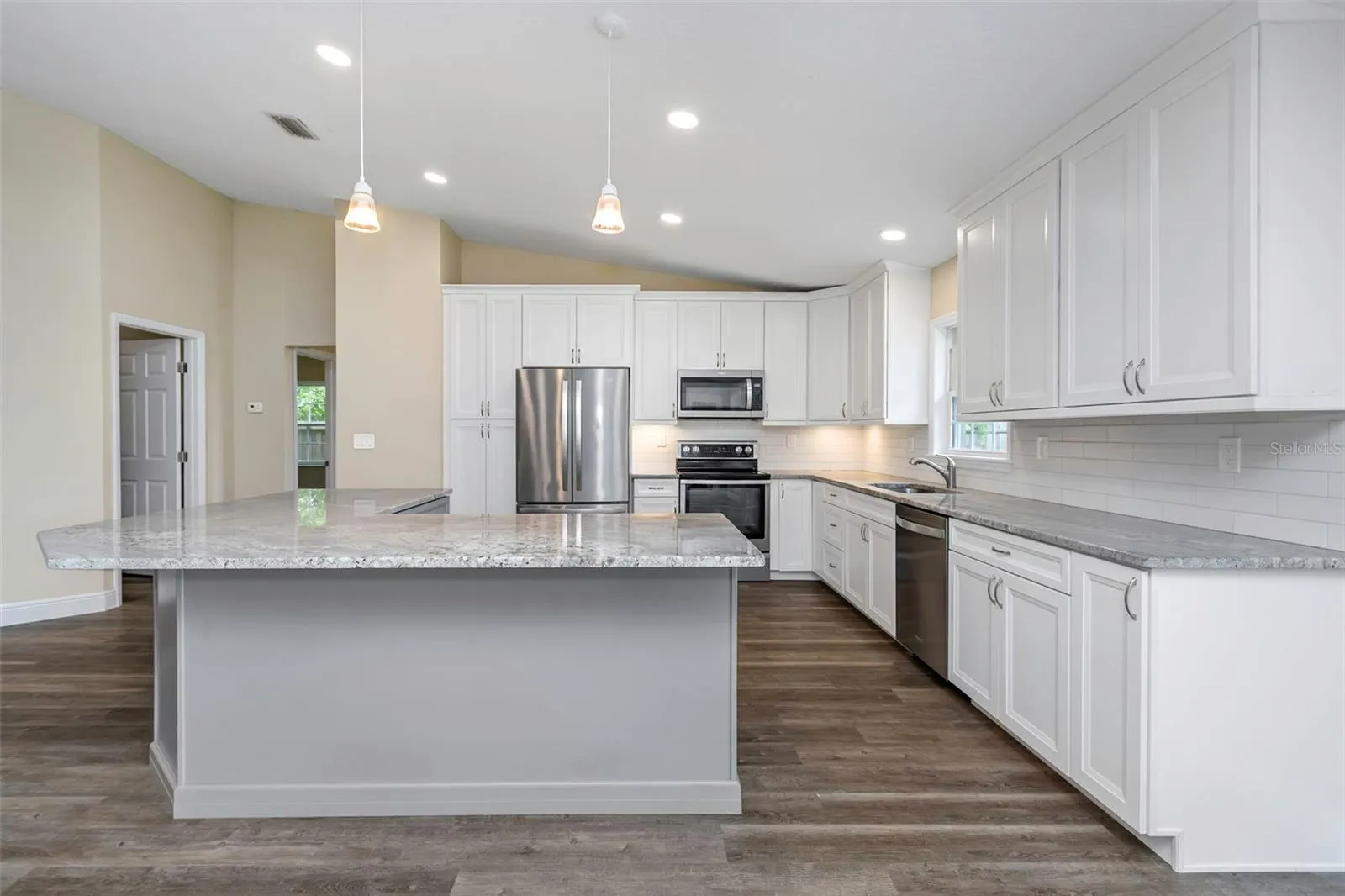 Desirable location in Palm Harbor and updated! NO HOA, NO FLOOD, NO CDD! 3 bedroom, 2 bath, 2 car garage. This open concept home has water views and mature tropical landscaping. Enjoy your custom kitchen with stainless steel appliances 2021, soft close cabinets and doors along wiht granite counter tops. Gather around the massive island for breakfast and other meals. Open concept… you got it, with unobstructed views to be a part of those great gatherings you’re going to host. New roof 2022 with transferable warranty, hot water heater and Electrical updated 2020. Updated windows and sliders for a beautiful view of the pond. Luxury vinyl/tile floors throughout. Fully fenced (fenced from Pond also). Split bedroom plan for privacy. All bathrooms are updated. The primary bedroom has an ensuite with a large vanity, double sinks and walk-in closet. Clean, bright and roomy with interior laundry room.