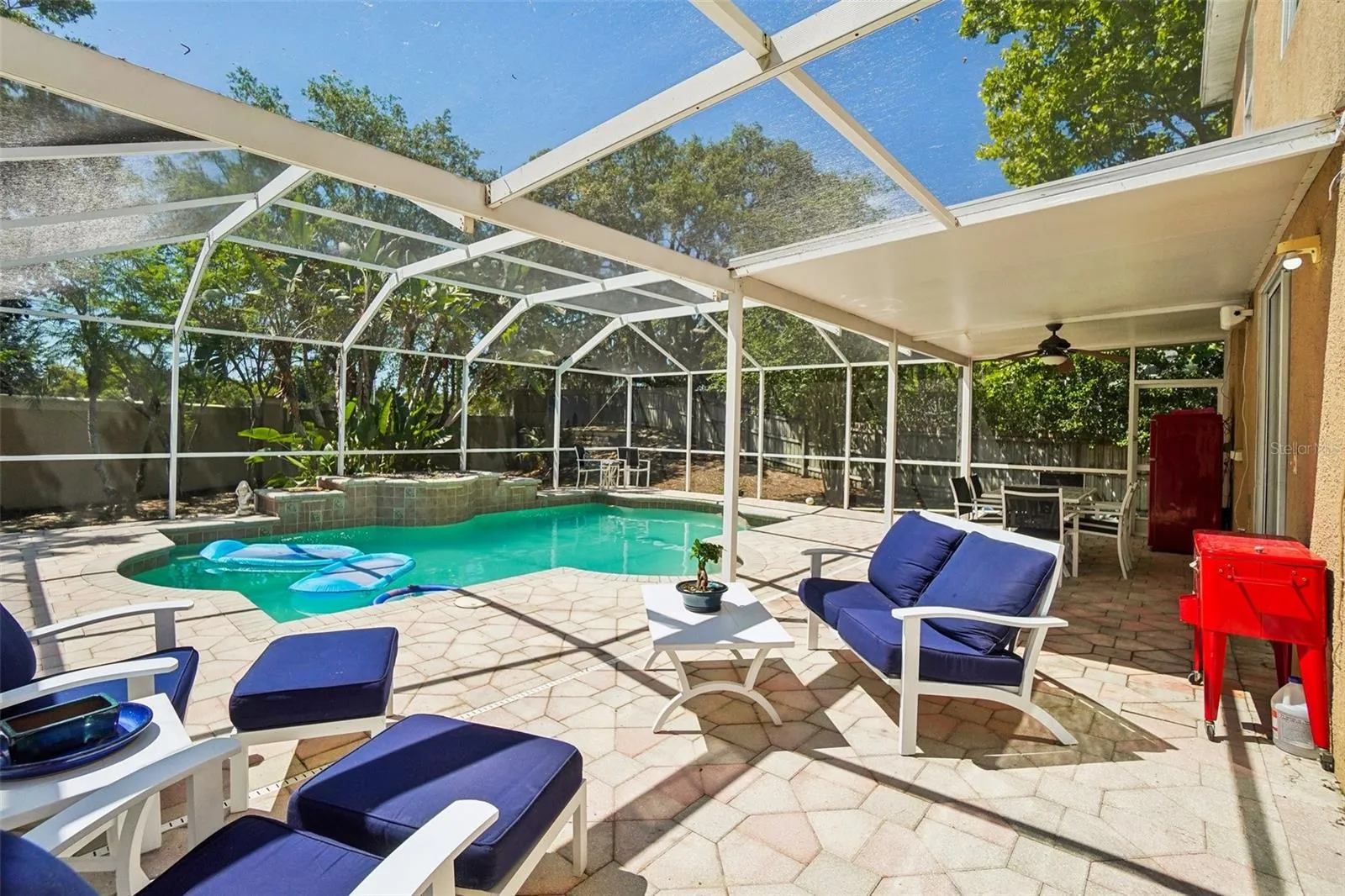 and kitchen open outside to the private screened oasis where a heated saltwater pool awaits you, cover paver patio, spillover waterfall. No