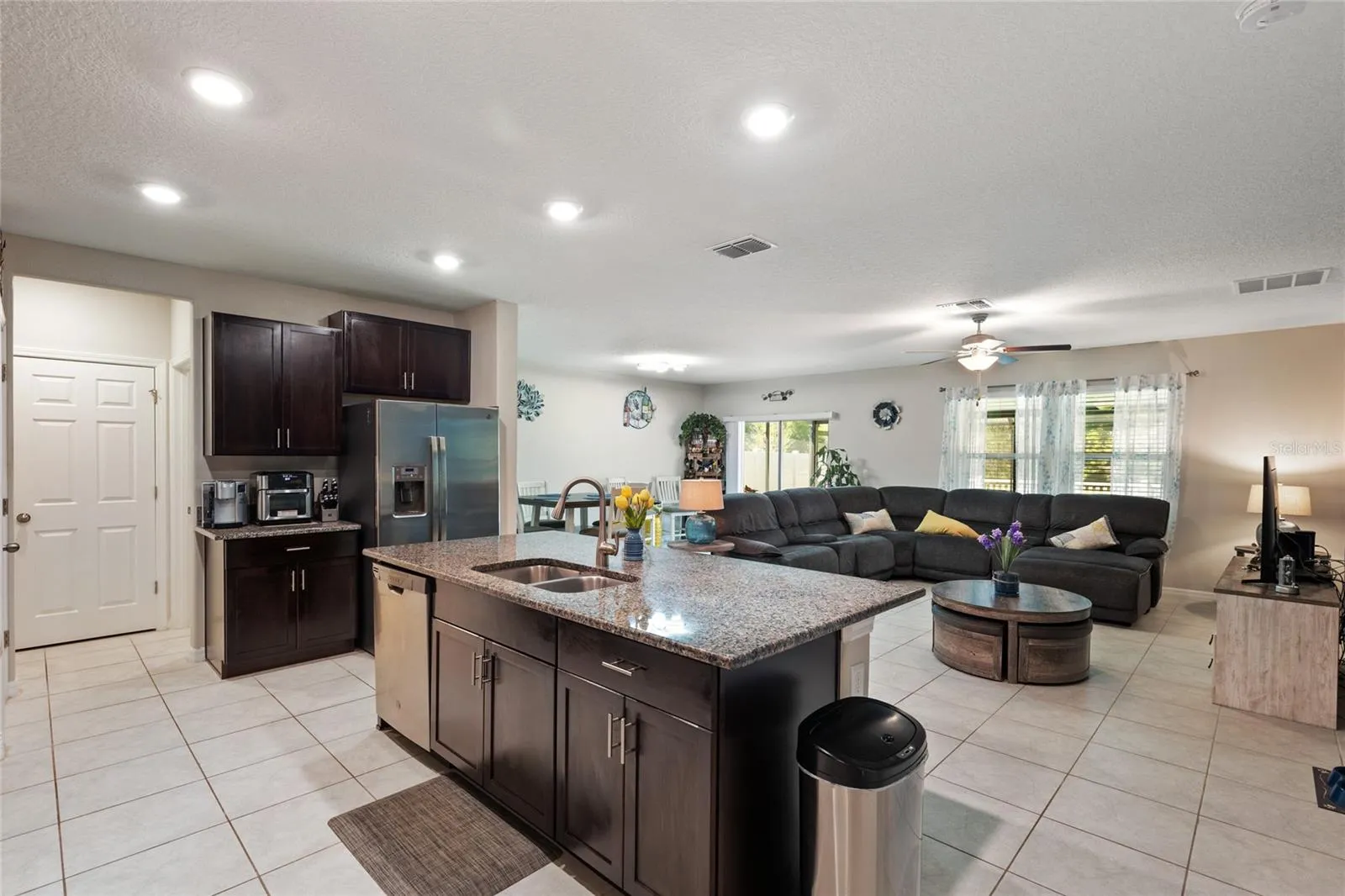 Indulge your culinary passions in the heart of the home – an open floor planned kitchen adorned with 36″ Staggered Chatham Umber raised square panel cabinetry, Stainless Steel GE® appliances, and Caledonia granite countertops (age of home). Picture yourself effortlessly preparing delectable meals while still being a part of the lively conversation.