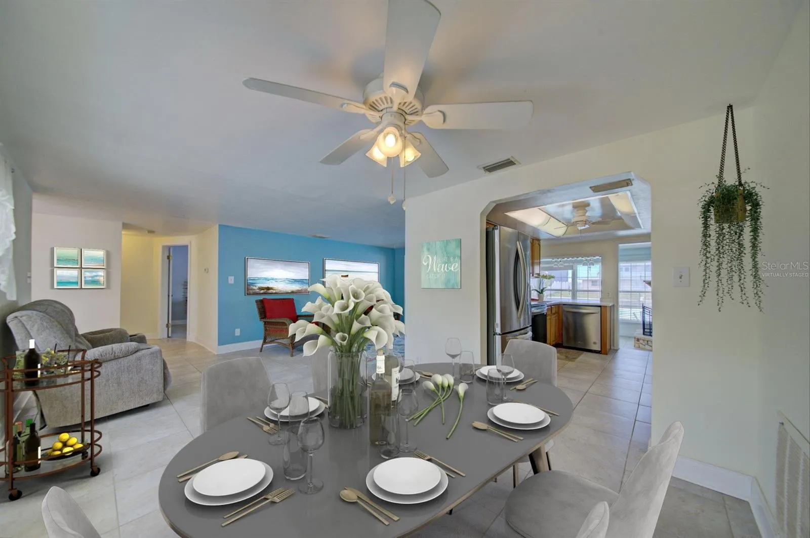 One or more photo(s) has been virtually staged. REDUCED TO $429K!!! THIS IS A GREAT 3 BEDROOM, 3 BATH,SALT POOL HOME with so much PERSONALITY! This gem can sleep 10 with ease! You will love the lanai, HEATED SALT POOL and deck, dock for your boat, Direct Gulf Access and more! The freshly painted concrete patio is great for grilling, raised garden, or storing kayaks. Hang out on the dock to enjoy the fish jumping, dolphins swimming, and birds chirping! The back space is equally wonderful for morning coffee or sipping your favorite drink! The newer kitchen has all NEW appliances, (10/23), NEW water heater, (10/23), ROOF and Solar Pool Heater, (6/22). NOW, just make it your own! View the front courtyard from the circular drive and you will feel the coastal vibe! As you enter, the combo living/dining leads to the sunroom view, as well as the pool and canal! Sunshine pours in for a truly “light and bright” feel! The sunroom offers a wood burning fireplace for cozy days and nights, as well as a breakfast bar. The screened porch is large enough for lounging as well as al fresco dining. The primary bedroom features a water view through the sliding door, en suite bath with a Sun Tube, and walk-in CEDAR closet! The front bedroom also has a walk-in cedar closet, and n updated hall bath separates the two rooms. The third bedroom off the kitchen is connected to the “pool bath,” and features an indoor laundry closet which offers convenience. This property has been a year ’round “Vacation State of Mind,” but it is also perfect for a winter retreat or a vacation rental that has options that many other properties do not have. It is truly the perfect setting for FLORIDA OUTDOOR LIVING! Hudson Beach is located close to shopping, medical facilities, restaurants, and wonderful local hangouts! Its less than an hour to Tampa International Airport, and 90 minutes to Disney! Come make an appointment and see for yourself!!!