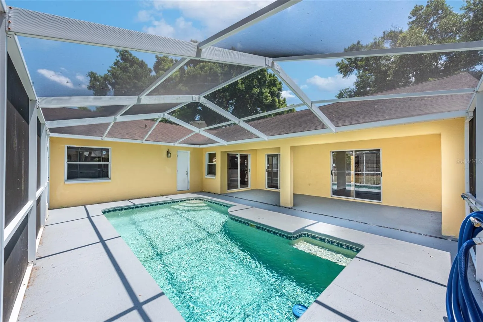 BACK ON THE MARKET WITH A REDUCED PRICE!! MOTIVATED SELLER! (Was not able to close due to a problem with the buyers loan). Welcome to your ideal home! This stunning property is nestled in a peaceful, smaller-sized neighborhood with no HOA or CDD fees. Sitting on a large lot with a huge, fenced backyard, it’s perfect for families, pets, or anyone who loves outdoor living. The yard is graced with mature oak trees that provide ample shade. Inside, the home features a split bedroom plan for privacy. The master suite is located on the left as you enter, while the remaining three bedrooms are in the rear wing. The office/den, with beautiful French doors, is just off the front foyer. The kitchen is open and airy, overlooking the breakfast nook and the family room with its inviting fireplace. There are three sets of sliding doors that lead out to the covered lanai, where you can enjoy the view of your private pool. The pool was resurfaced in 2018, adding to its appeal. The third full bath conveniently opens to the lanai, perfect for pool parties or outdoor entertaining. Other features include an inside utility room with washer/dryer connections, and the roof was replaced in 2017, while the air conditioning unit was replaced in 2018, the water heater was also replaced in 2019. These updates ensure that the home is move-in ready and energy-efficient.