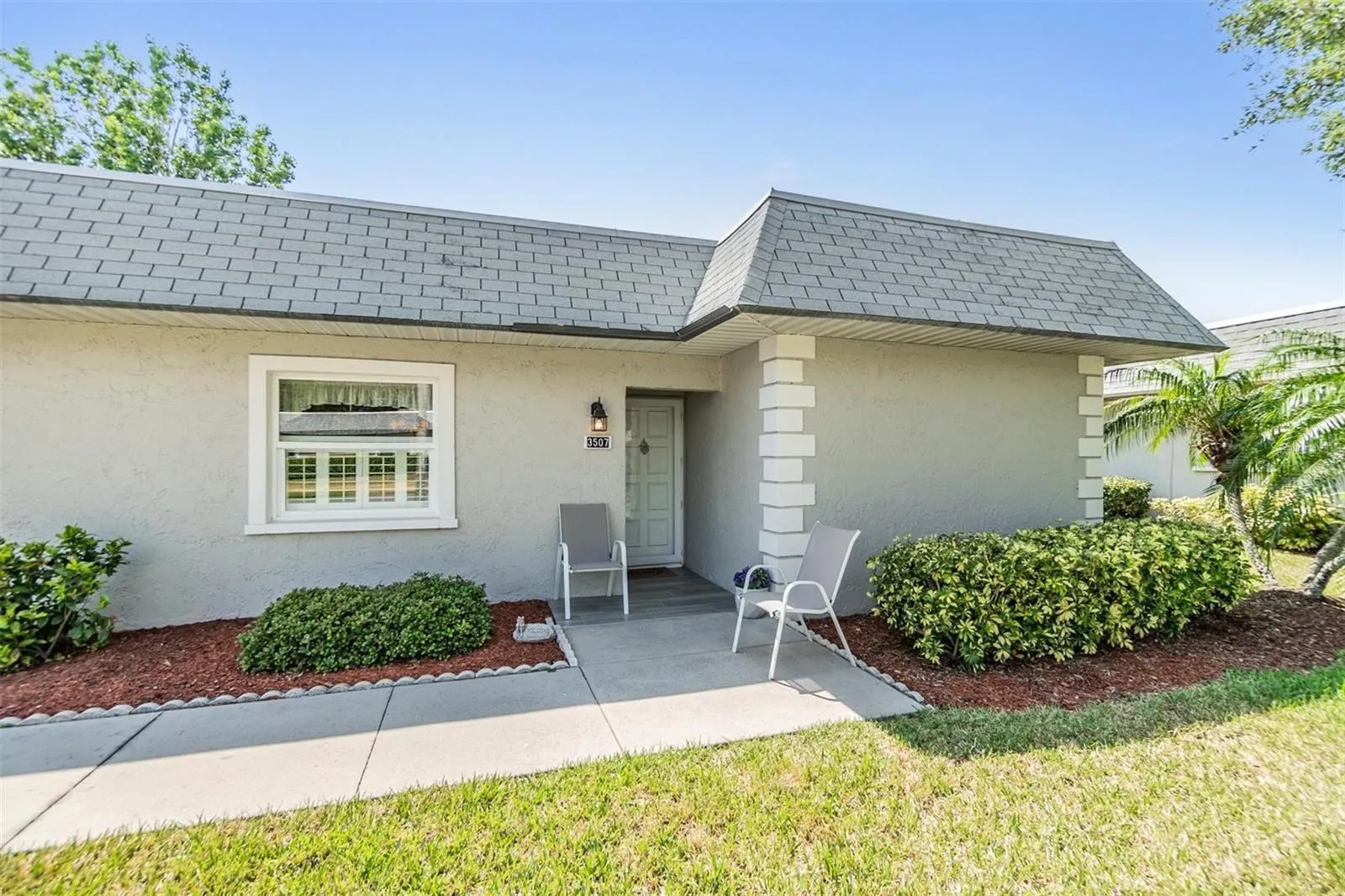 THIS GORGEOUS CONDO IS IN MINT CONDITION AND LOCATED ON THE GOLF COURSE WITH FANTASTIC VIEWS! This is an “end unit” condo with a spectacular floor plan! The Kitchen boasts Quartz counter tops, Wood Cabinets, Tile back splash, and breakfast bar! The Primary Bed/Bathroom is oversized and features a walk-in closet, Dual Vanity, and walk-in shower! 2nd Bedroom also has a walk-in closet and 2nd Bathroom is very spacious! The bonus room is semi-private and is perfect for an office, hobby, or sitting room! Other great features inside include its wood-like tile flooring in some main areas, newer windows, plantation shutters, and water softener/filtration system! Relax out back on the shaded patio and enjoy one of the best views this community has to offer! All of this in the highly sought Golf Course Community at Seven Springs which includes a community pool, Tennis courts, Pro shop, restaurant, and so much more! Close to Trinity Hospital, doctors offices, and great shopping and Dining! Wonderful school district as well!
