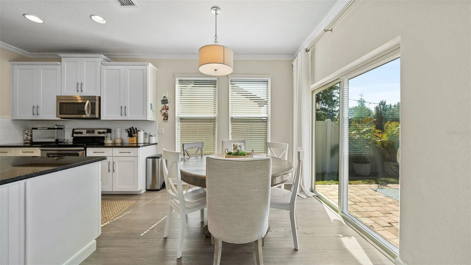 and has an attractive tray ceiling, crown molding, wood floors and a