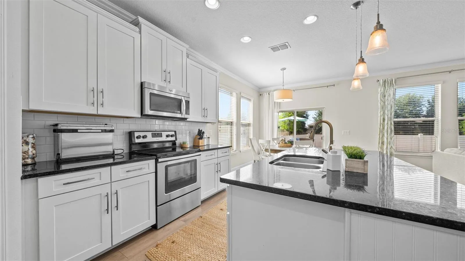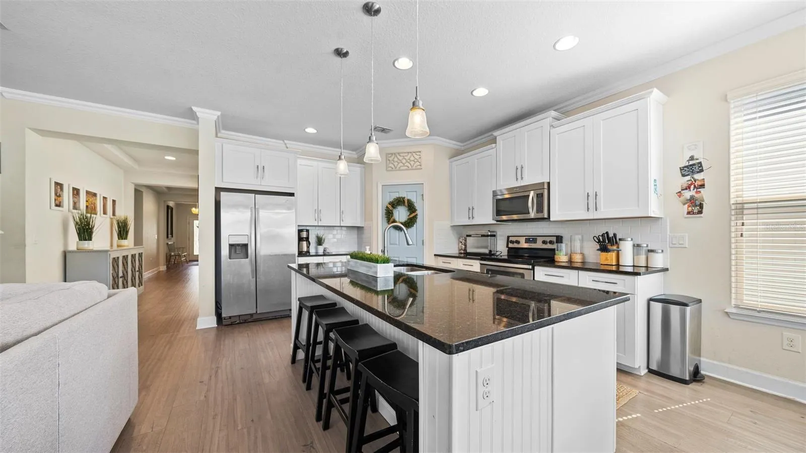 - Ceiling Fans(s), Crown Molding, Open Floorplan, Walk-In Closet(s), Eat-in Kitchen, Kitchen/Family Room Combo, Primary Bedroom Main Floor, Split Bedroom, Window Treatments, High Ceilings, Stone Counters, Solid Surface Counters, Tray Ceiling(s), Chair Rail