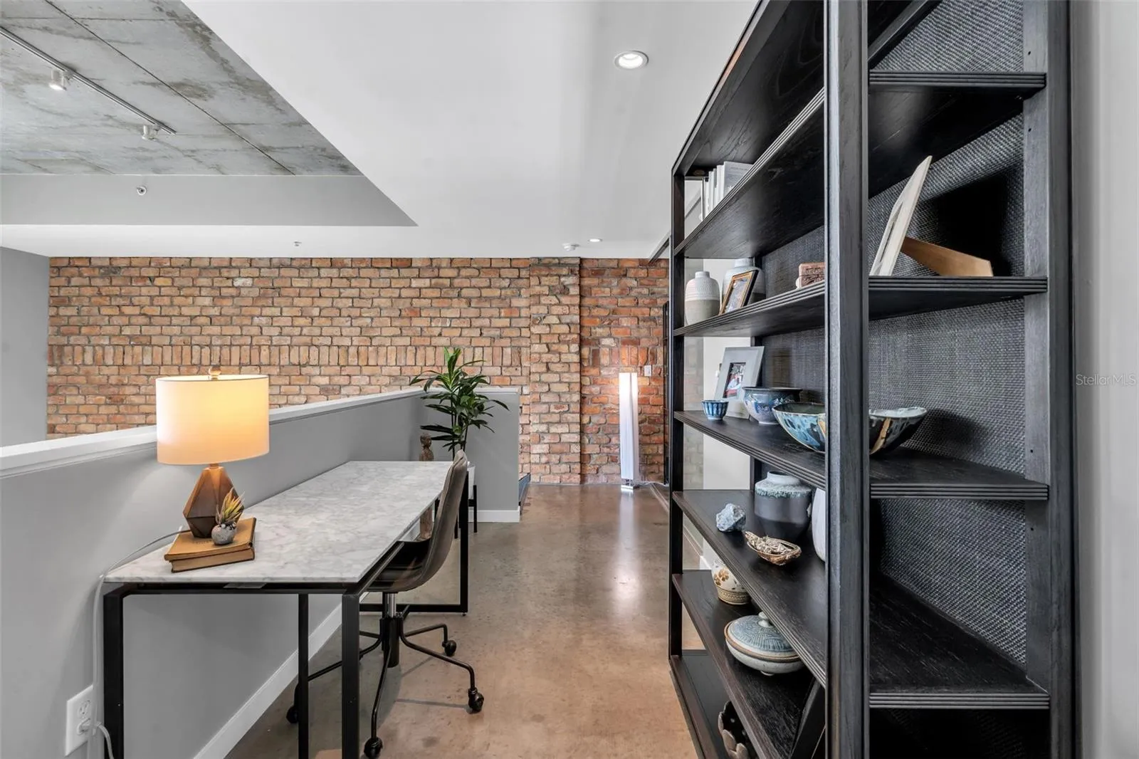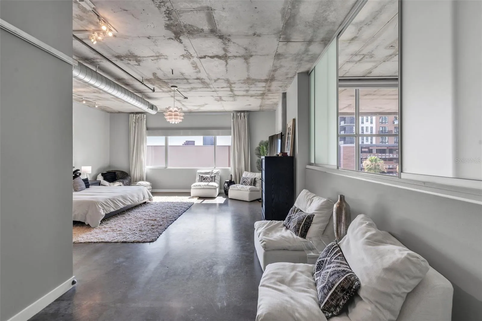 Additional features of the loft include polished concrete floors throughout, enhancing the modern industrial aesthetic, remote-controlled shades and neutral draperies on all windows, and two parking spaces along with a storage cage included with the unit.
