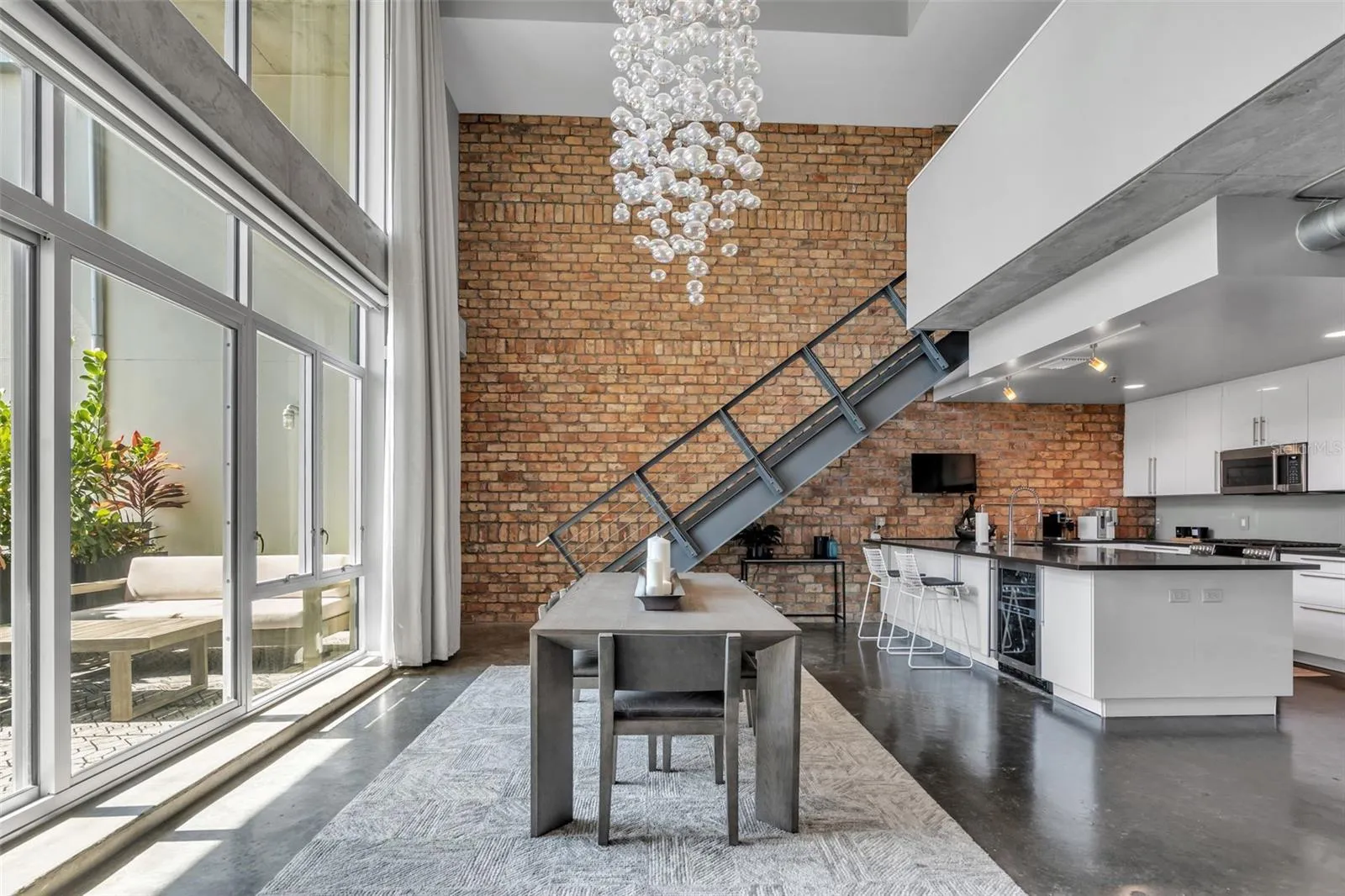 Looking for downtown living, but don’t want to sacrifice on space? This extraordinary loft apartment blends spacious modern luxury with industrial charm. This meticulously designed space features a bright and open floor plan with soaring 20-foot ceilings and exposed brick walls, providing an airy and inviting atmosphere. The open living and dining area, boasting a custom 12-foot blown glass chandelier, a contemporary dining setup, and balcony access, perfect for hosting dinner parties. Large windows offer abundant natural light and stunning views.