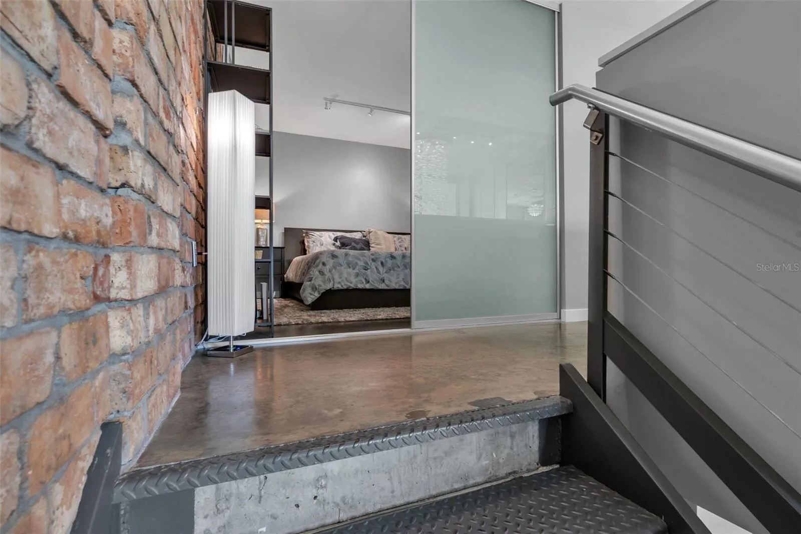 The lofted bedroom area (26×20) provides added privacy and comfort, featuring two custom-built walk-in closets (11×16) and sliding frosted glass privacy doors. An additional guest bedroom (12×12) offers a generous closet space and convenient access to in-unit laundry facilities.