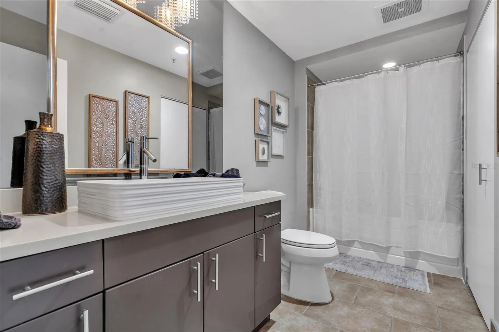 The spacious master bathroom (8×14) features a double vanity, large mirrors, and a walk-in shower with elegant mosaic tile work. An additional en-suite bath includes a tub, modern cabinetry, and quartz countertops.