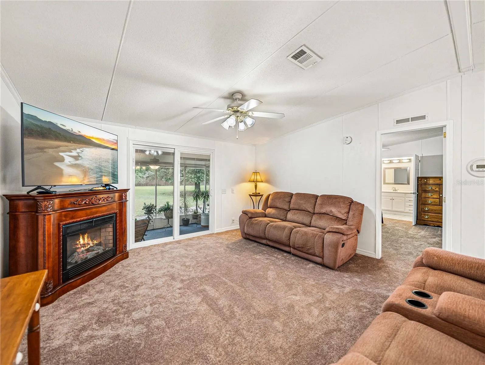 that open to the screened porch, blending indoor and outdoor living. The primary bedroom is a