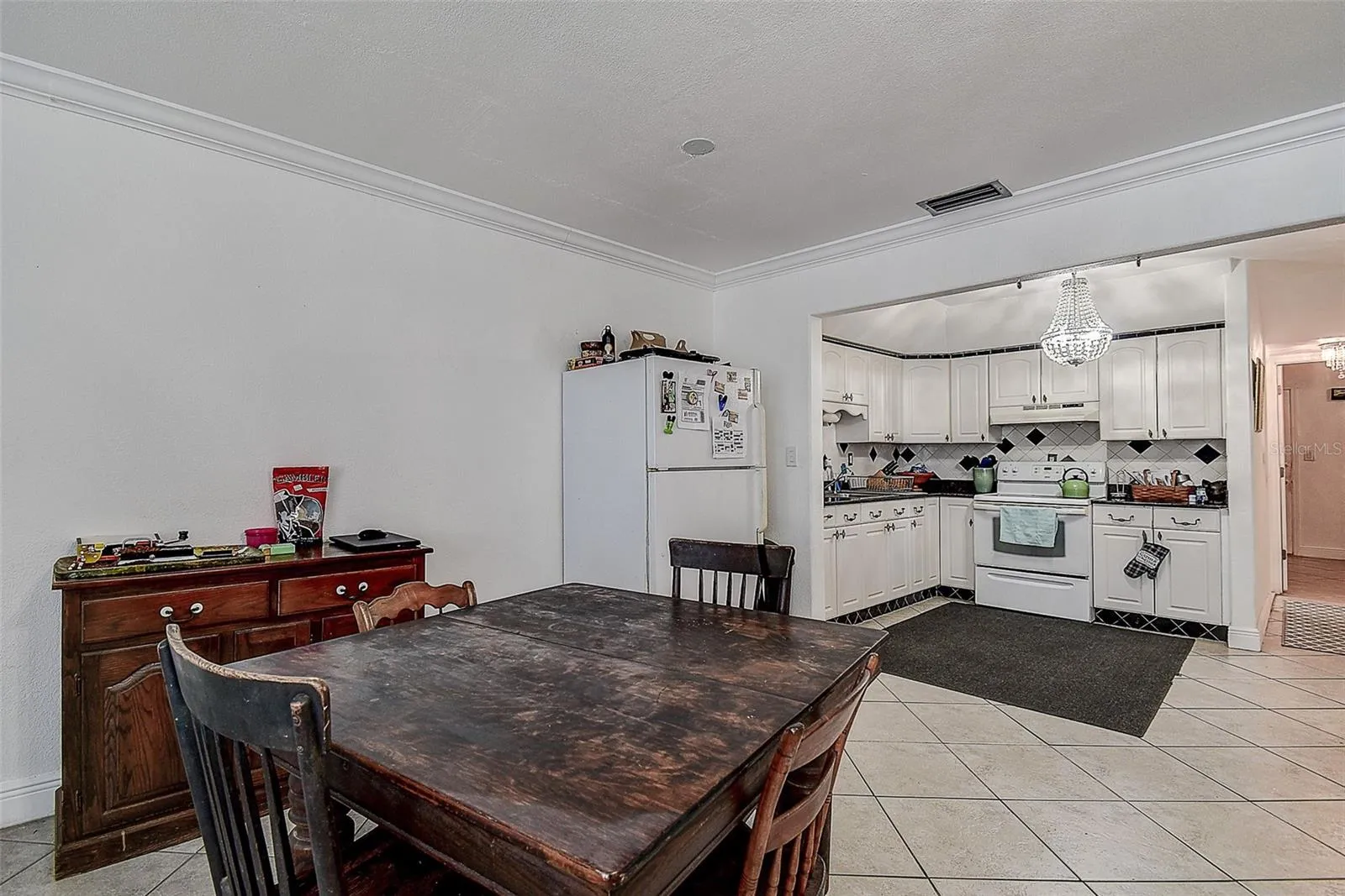 Adjacent to the living room, the dining area provides a lovely space for meals with family and friends. Imagine enjoying your morning coffee or hosting dinner parties in this charming setting. The tile flooring throughout the home adds a touch of elegance and ensures easy maintenance.