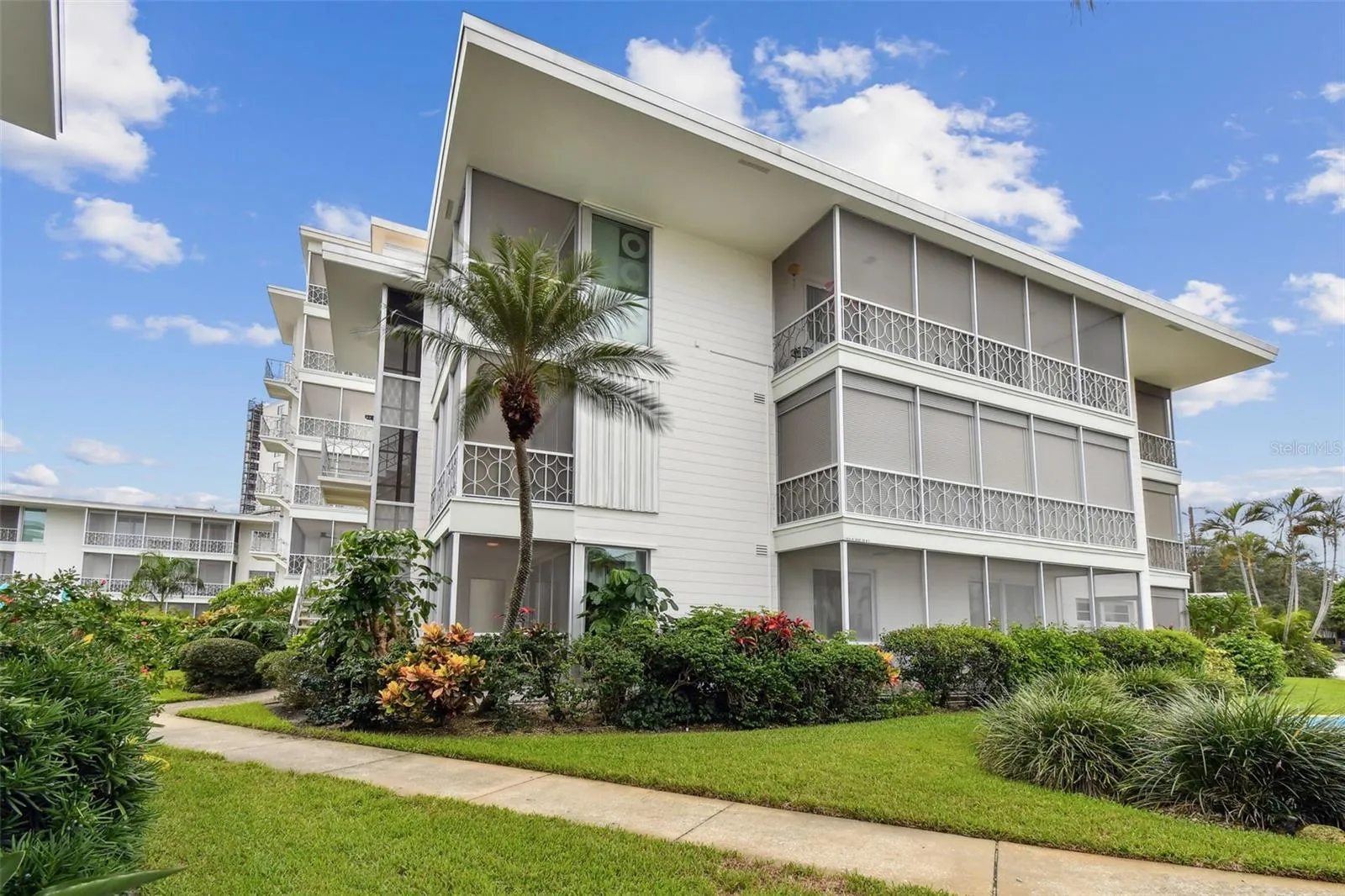 Newly listed wonderful Whispering Waters top-floor condominium in the heart of the historic district of downtown St. Petersburg. Buyers will enjoy uptown living with gorgeous sunrises over Tampa Bay and Vinoy Park at your doorstep. Step inside this mid-century modern building and experience both modern amenities and vintage charm. The floor plan is open and inviting allowing plenty of natural light from your updated hurricane sliders. Buyers will delight in spacious screened-in balconies with newly polished terrazzo tile off both the living room and kitchen to easily entertain all your family and friends. The color palette throughout the space is cheerful and welcoming. The updated kitchen features solid wood cabinetry, soft-close drawers and granite countertops. Sleek engineered hardwoods run throughout the open-concept living and dining space. There is plenty of room for your holiday gatherings allowing guests to comfortably mingle. A cleverly designed workspace in the hall entry is perfect for the work-from-home lifestyle and planning amazing vacations. The full bath off the hallway features the vintage charm of perfectly preserved bath tile from a bygone era and is sure to bring a smile to your face, while a modern vanity with pull-out storage fits your everyday lifestyle. The guest bedroom is ample in size and features plenty of closet space, natural light, a modern slider to the balcony, and custom lighting. The sizable primary suite features an en-suite bath with a vintage tub, modern vanity and ample storage, double closets, custom lighting, and room for a King-size bed. A convenient laundry closet is located just off the main bedroom. Also featured in this fabulous property are a split garage with an automatic opener, lovely grounds with an updated pool and re-surfaced deck, a building elevator and a new roof in 2023. The condominium association fee covers all utilities, including electric, water, sewer, trash, internet, maintenance grounds, reserves and insurance. This condominium provides an ideal location to walk to all your favorite Beach Drive restaurants, shops and museums. The St. Pete Pier is a great morning walk-in route to your favorite coffee shop. This condominium will enchant, delight and entertain your senses with a delicate touch of whimsy. Call for your showing today and see why St. Petersburg is truly the Sunshine City.