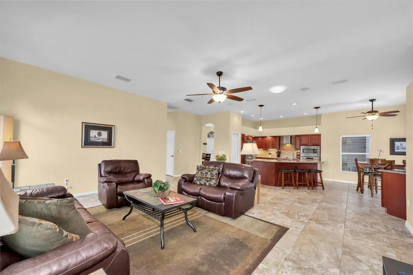 - Ceiling Fans(s), Open Floorplan, Thermostat, Walk-In Closet(s), Living Room/Dining Room Combo, Eat-in Kitchen, Kitchen/Family Room Combo, Primary Bedroom Main Floor, Split Bedroom, Window Treatments, High Ceilings, Stone Counters, Solid Wood Cabinets, Built-in Features
