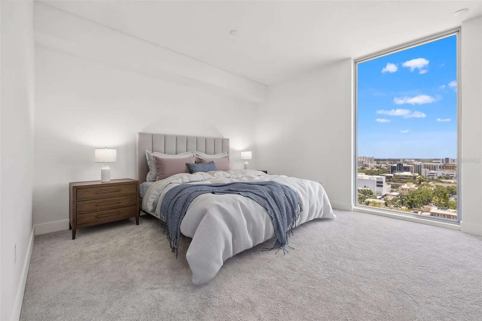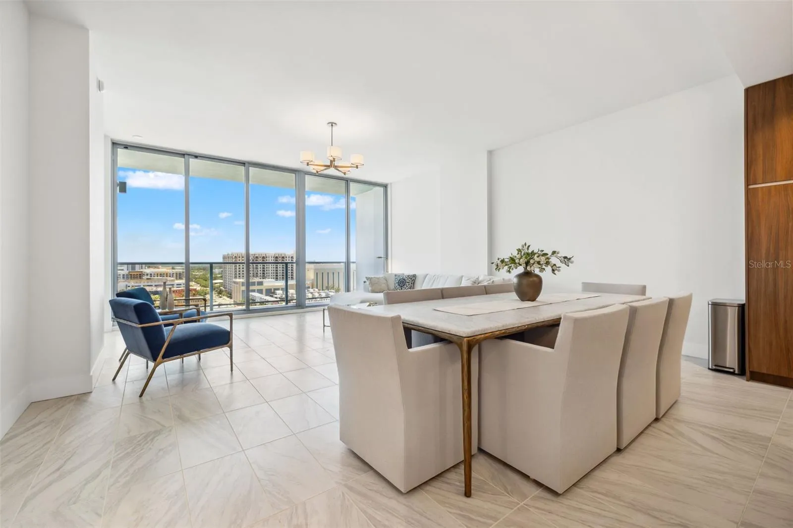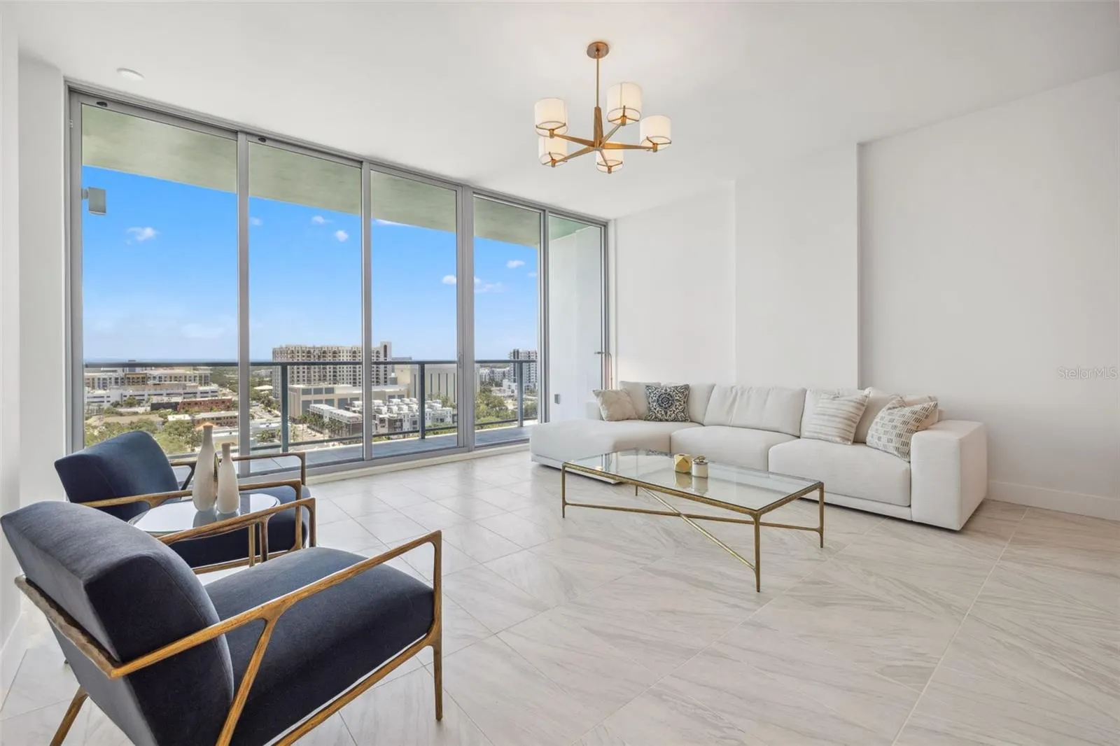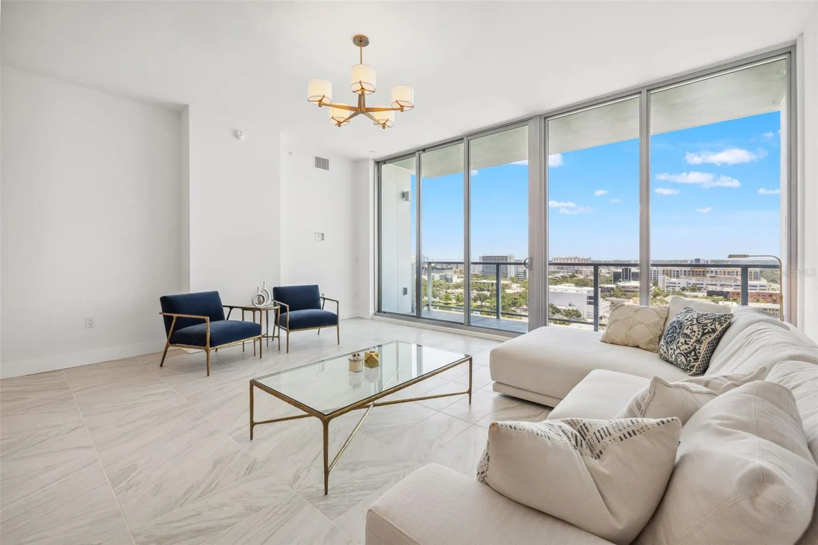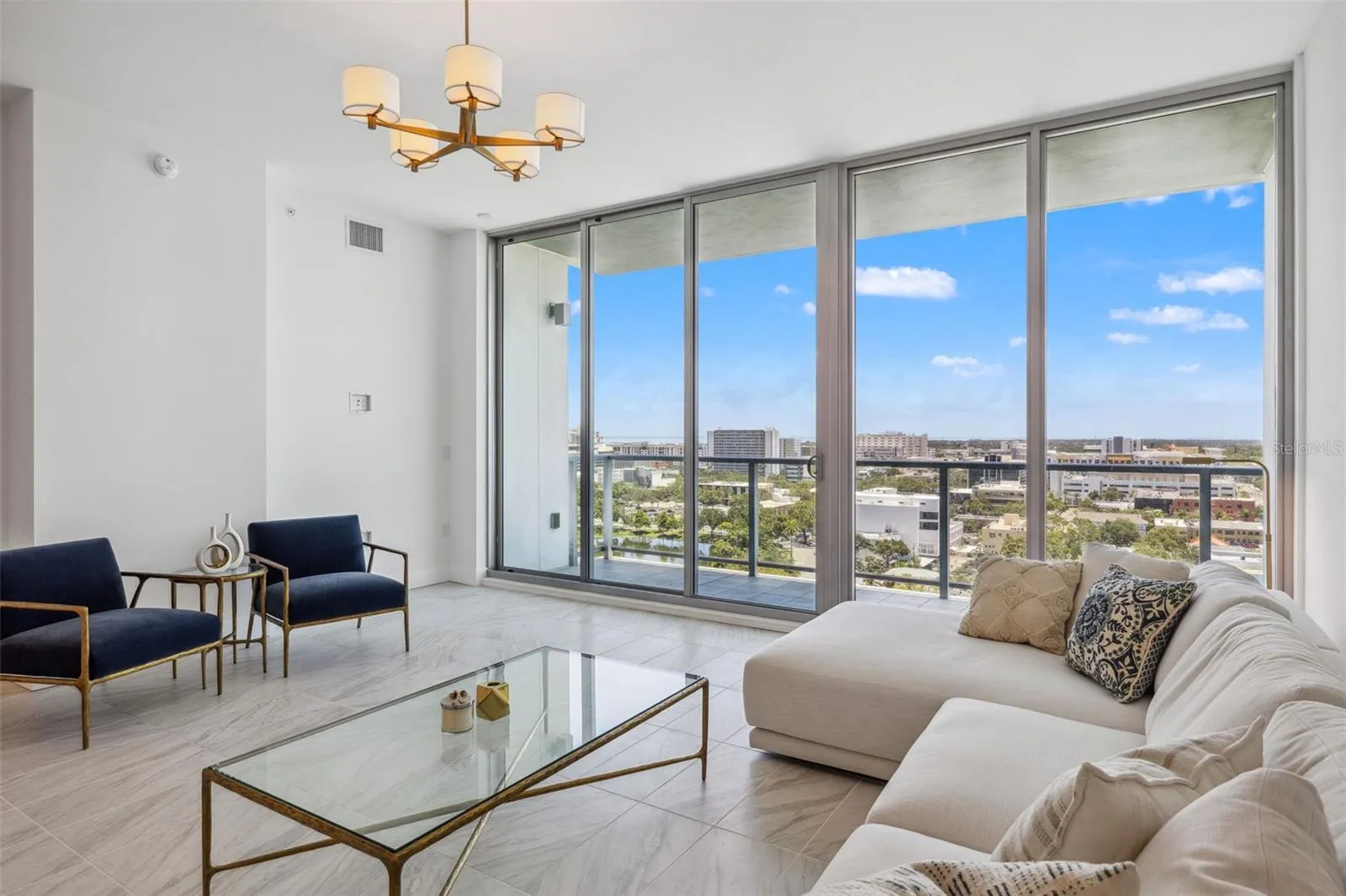 Walls of glass flood the open-concept living space with natural light and frame unforgettable views of Mirror Lake, the downtown skyline, and Tampa Bay. A spacious private terrace provides the perfect backdrop for morning coffee at sunrise or evening sunsets.