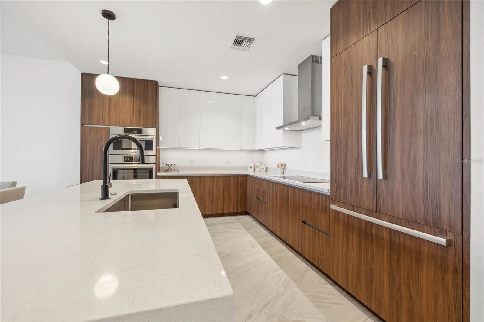 Step inside and discover soaring 9.5-foot ceilings, gleaming porcelain tile floors, and a stunning chef’s kitchen featuring sleek quartz countertops, a waterfall island, and high-end Bosch panel-ready stainless steel appliances.