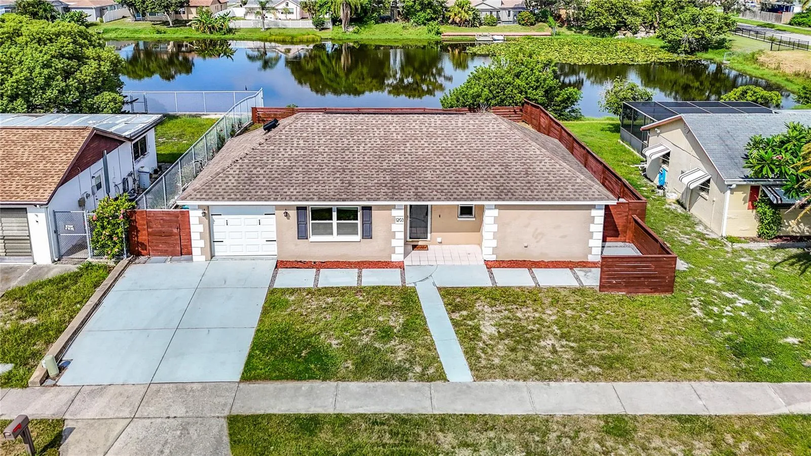 Welcome to your new haven! This delightful single-family home offers 872 sq ft Featuring 2 bedrooms and 1 bath, and 1 car garage, this residence combines functionality with a touch of elegance. The house have a inviting and open floor plan with vaulted celling, dining room with French door leading to enclosed lanai over looking the lake, A sunlit retreat perfect for relaxation or entertaining, with expansive windows that invite the outdoors in. When weather is nice, you can step out to your deck, enjoy your morning coffee or unwind in the evening while overlooking a picturesque lake view. The deck is ideal for outdoor gatherings or quiet moments of reflection. Kitchen features, updated cabinets, Granite counter tops and stainless steel appliances. This home offers a tranquil escape while remaining conveniently close to local amenities, dining and shopping. Don’t miss this opportunity to own a piece of paradise with stunning water views and charming living spaces and best of all Not in a Flood Zone!