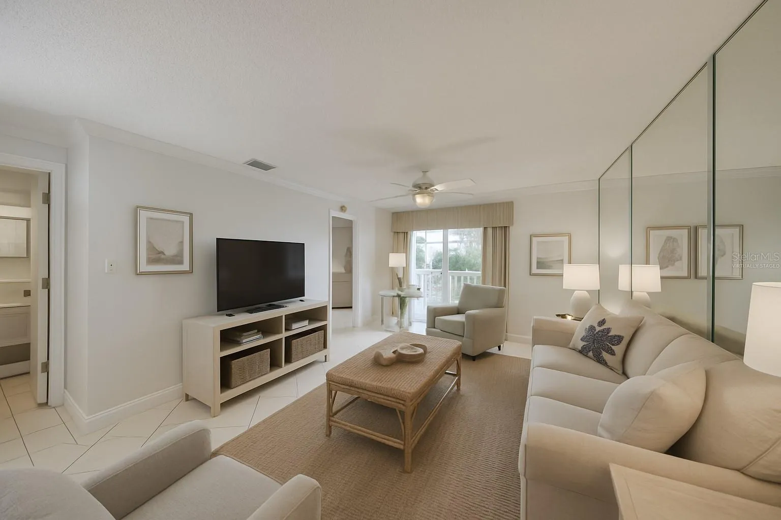 - Ceiling Fans(s), Thermostat, Walk-In Closet(s), Living Room/Dining Room Combo, Primary Bedroom Main Floor, Split Bedroom, Window Treatments