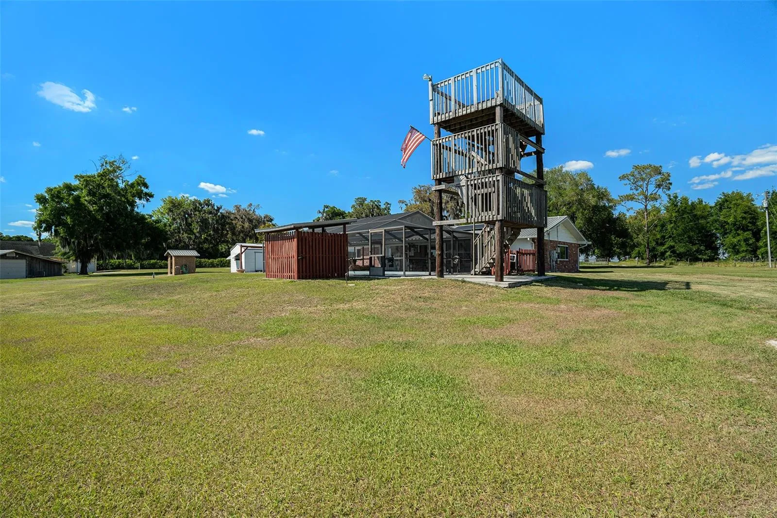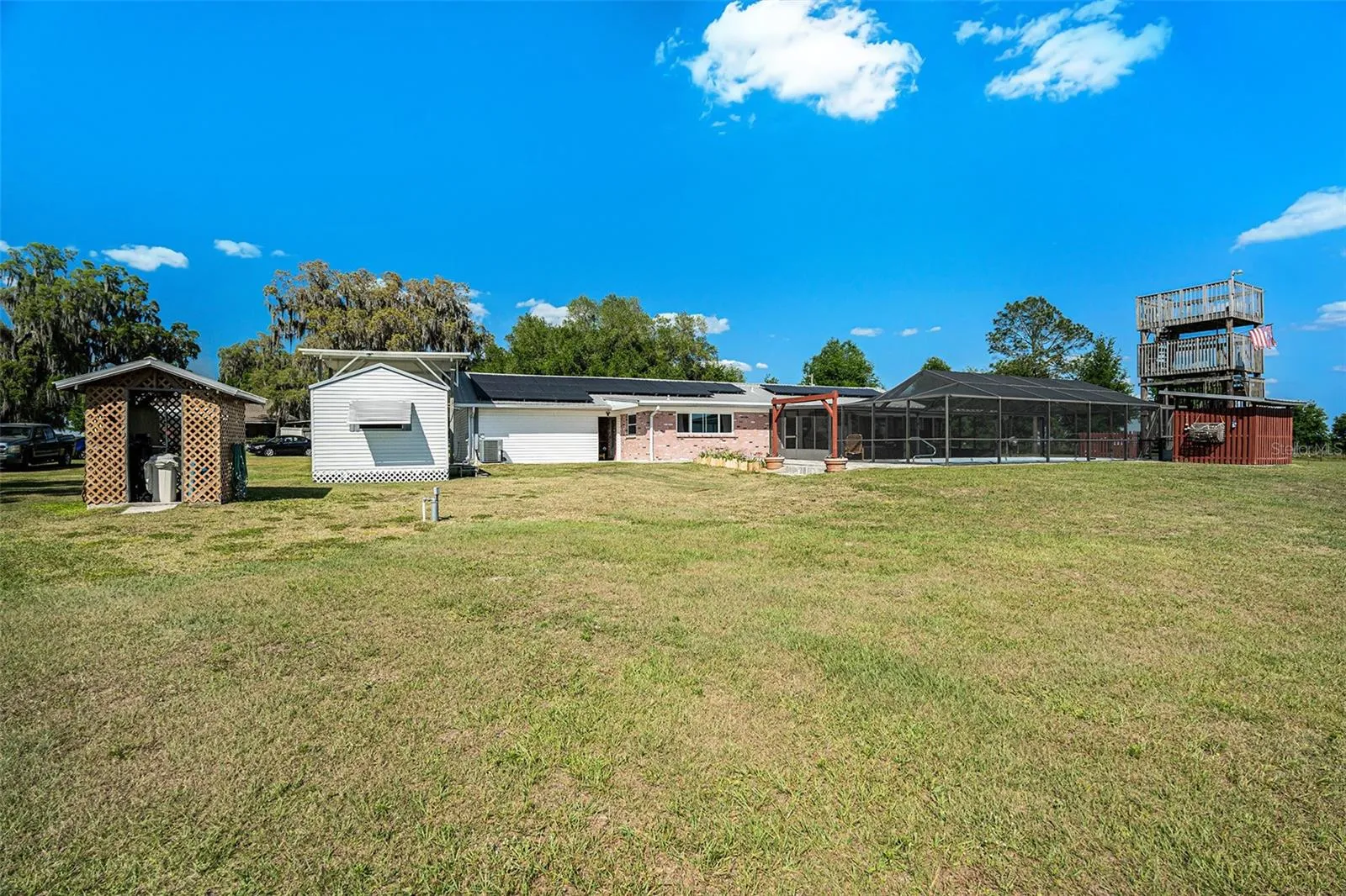 3 beds, 2.1baths, 2 acres, RV Space, pool, observation tower, metal roof, PAID solar panels and more! Move-in ready and meticulously maintained home offering comfort, efficiency, and stunning rural charm. Situated on a scenic 2-acre lot atop a hill, the property boasts sweeping vistas that are further accentuated by a one-of-a-kind 17-foot observation tower. Imagine starting your day with breathtaking orange grove views and their delicious orange blossom smell! Entertain your guests in style in the pool area, with a convenient exterior bathhouse (toilet, shower and a garden tub). **RV ENTHUSIASTS: Covered RV space, with ready-made septic and water hookups! **LOCATION: You’re still close to everything you need: stores, restaurants, coffee shops, and a hospital are all conveniently located within a 3-mile radius, making daily errands a breeze. With easy access to Withlacoochee Springs, Busch Gardens and many parks, you can enjoy fishing, kayaking, and exploring the natural beauty of the area. Plus, Tampa Airport is only an hour away, making it easy for travel and visits from loved ones. **PEACE OF MIND: block home with brick exterior, metal roof, updated AC/water heater, brand new septic tank and well, plus a tankless water heater for instant hot water. All new windows, and the foundation is in excellent condition. Energy bills are a breeze with paid solar panels – your average monthly bill is only $30! This elevated haven is naturally protected from water intrusion concerns. **INTERIOR: Beautiful hardwood and laminate floors, completely renovated bathrooms, and a convenient, recently updated laundry room. The kitchen boasts a gas range, while cost-effective propane keeps your water hot and cooks your meals (and it’s currently full!). **STORAGE: This property is a haven for those who love to work with their hands. The massive 2-car garage, complete with shelves, offers the perfect workspace for your projects. Store your tools, equipment, and vehicles with ease, and enjoy the convenience of a spacious attic and shed for additional storage! **BONUS: Most furniture is included in the sale, making this a truly move-in-ready opportunity.