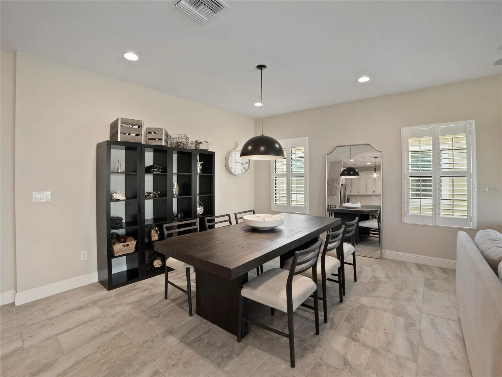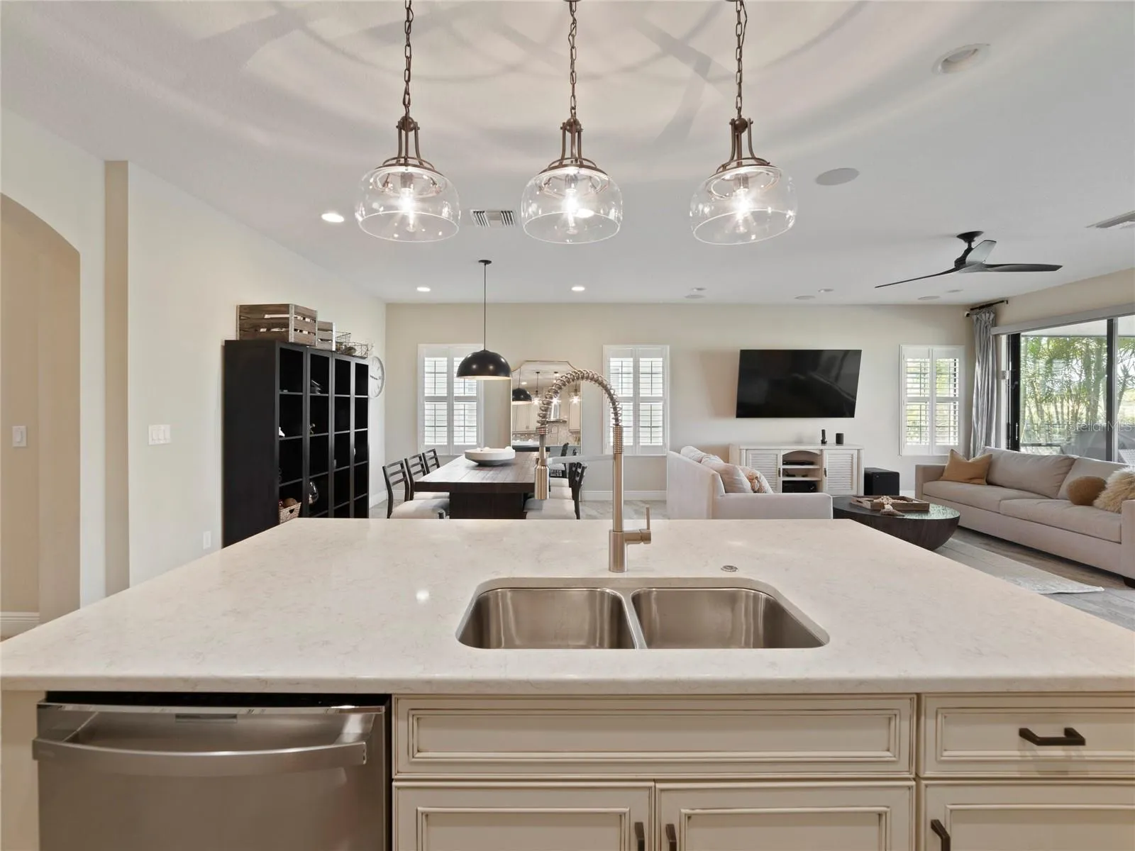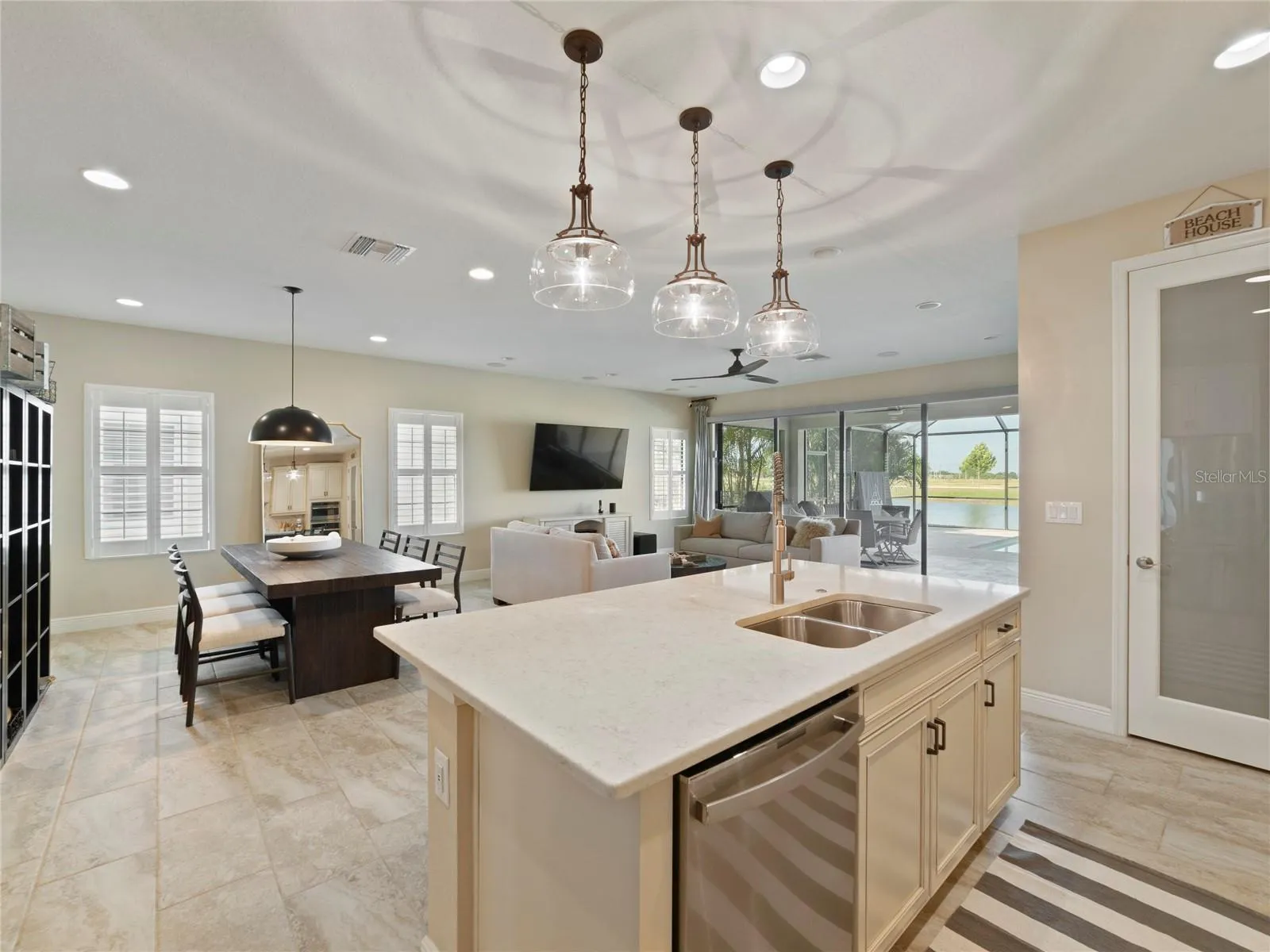 Welcome to this beautiful 3-bedroom, 2-bathroom, with Den, pool home located in the sought-after community of Waterset in Apollo Beach with No Backyard neighbors. This residence offers a perfect blend of style, functionality, and comfort. Step inside to the foyer accented with a brick wall, arches and crown molding adding a unique style and touch,The kitchen is a true standout, featuring stainless steel appliances, quartz countertops, luxury tile backsplash that adds a touch of elegance, breakfast bar with pendant lighting, a double oven, a beautiful hood vent, and an abundance of Off White cabinets with crown molding and hardware for all your storage needs. The walk-in pantry provides additional convenience and organization as well with a glass door. The kitchen seamlessly flows into the living room and dining room, creating a spacious and open-concept living area. Prepare to be impressed by the gorgeous plantation shutters and High ceilings throughout enhance the overall sense of spaciousness. The porcelain tile flooring adds a touch of sophistication and durability. 8′ Modern style interior doors. Surround sound speakers amplify throughout the great room. The large owner’s suite offers a peaceful retreat, complete with crown molding, walk-in closets and a full bathroom. The bathroom features dual quartz vanity sinks and a walk-in frameless glass shower, creating a spa-like experience in the comfort of your own home. The split floor plan places the remaining bedrooms and bathrooms on the opposite side of the home, offering privacy and separation. The secondary bathroom features off white cabinets with square vanity sink, tub/shower combo with decorative listello tiles. Electric blinds lead out the sliding glass doors that open fully out to the covered lanai with Travertine decking. The in-ground heated salt water swimming pool provides a perfect setting for relaxation and entertainment. Additional features: Rain Gutters installed around the home to protect the exterior. Dimensional Shingle Roof. Ceiling fans throughout. The community of Waterset features amenities such as a luxury community pool, kiddie pool, splash zone, lap pool, clubhouse, fitness center, a dog park, a cafe/restaurant, a fishing dock, picnic areas with outdoor grills, walking/jogging trails with fitness equipment, playgrounds, soccer fields, tennis courts, basketball courts, volleyball courts, and much more! Don’t miss the opportunity to experience the lifestyle offered in Waterset. Schedule a visit today and envision yourself living in this remarkable Apollo Beach home with its desirable features and inviting outdoor oasis.