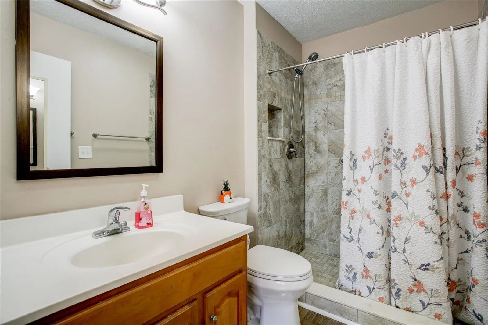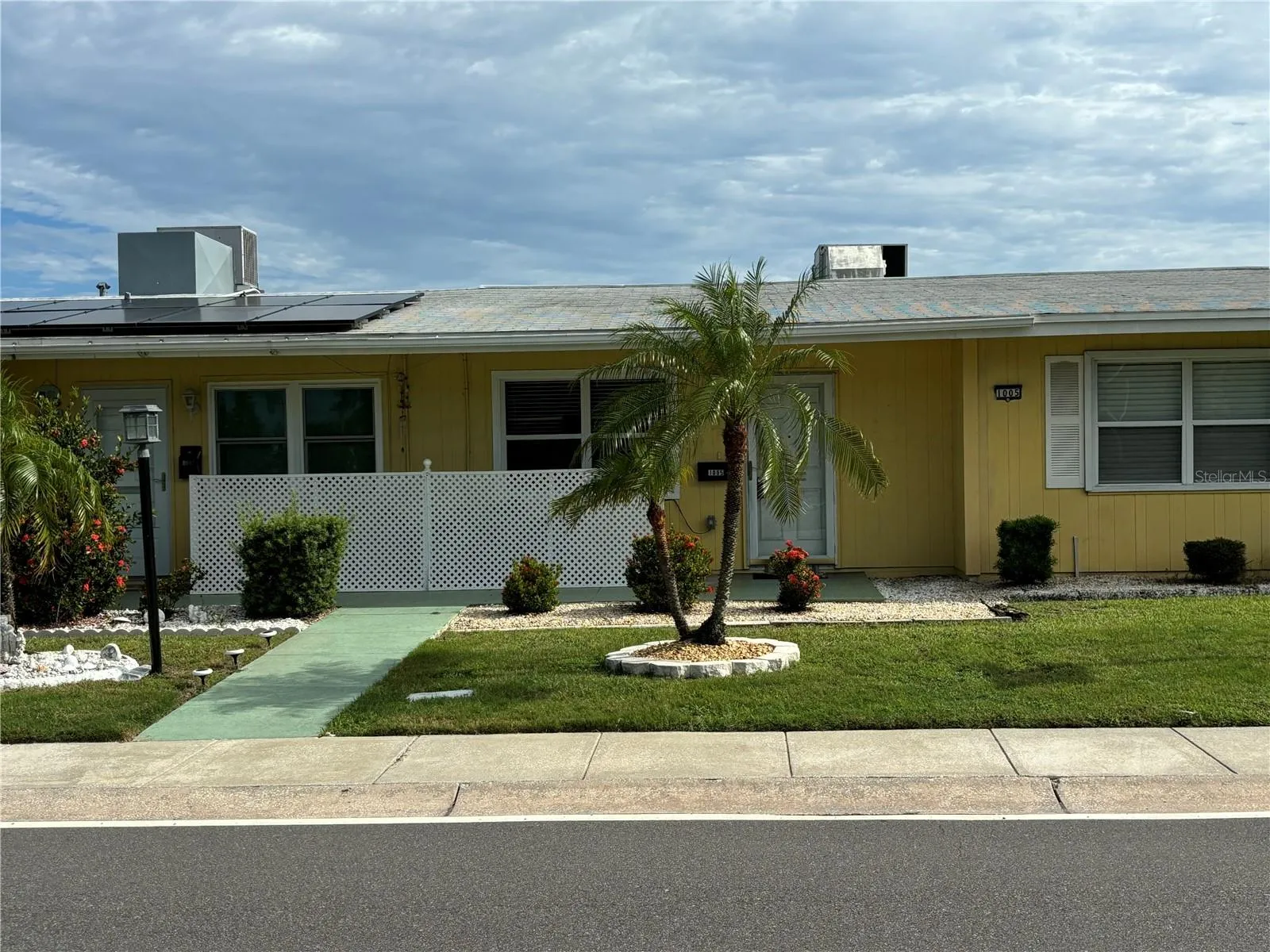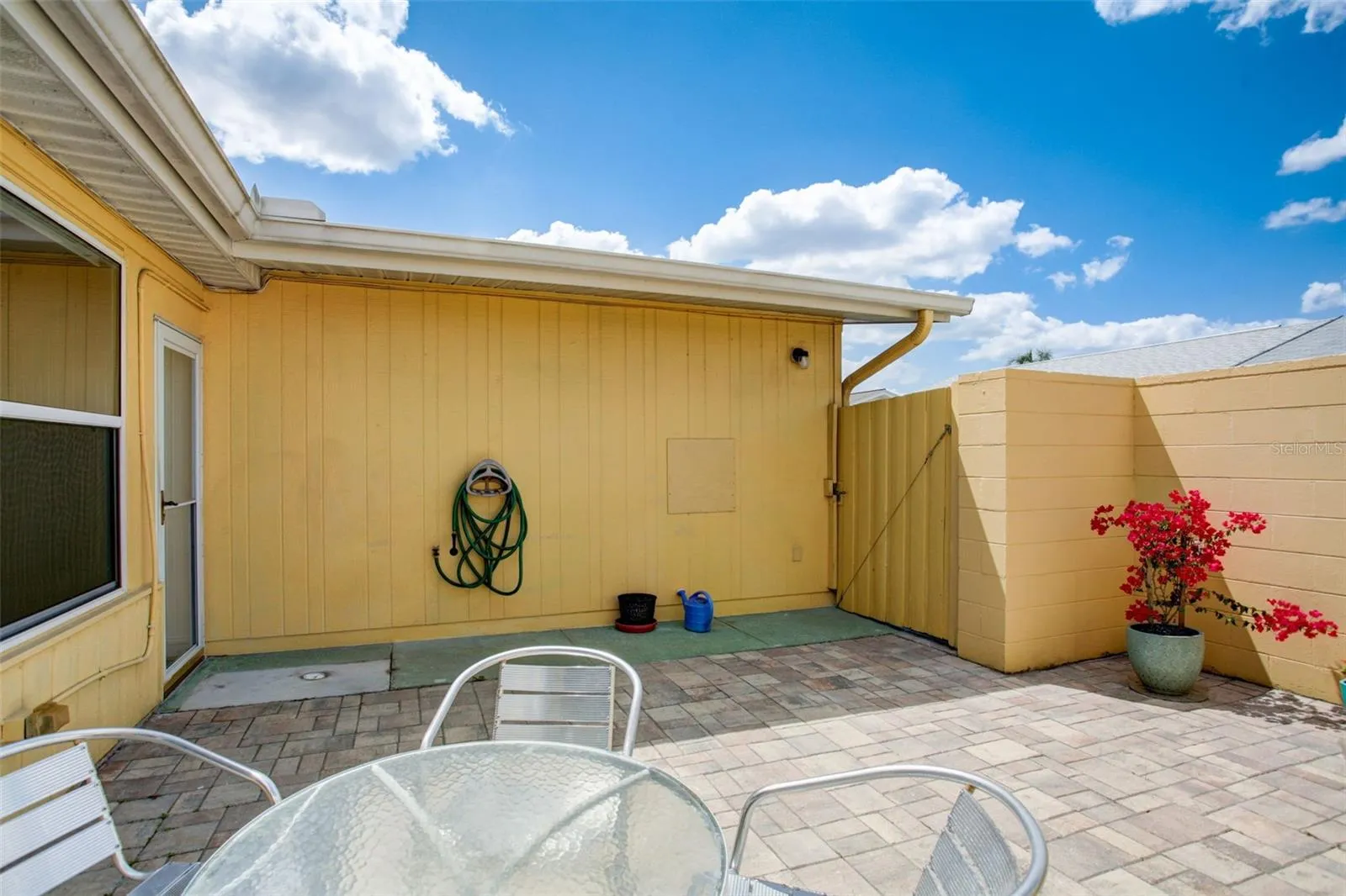 The bathroom has been thoughtfully designed with a surrounding tiled walk-in shower and a comfort height toilet, updated with a newer light and mirror for a fresh look. Additional convenience is provided by two storage closets in the laundry room, and walk-in closets in both bedrooms, offering extensive space for essentials. One of the home’s highlights is the Florida room, complete with a portable AC unit, where you can enjoy views of the enclosed patio. This patio area is designed for privacy and leisure, featuring an open-air setup with attractive pavers, perfect for outdoor enjoyment.