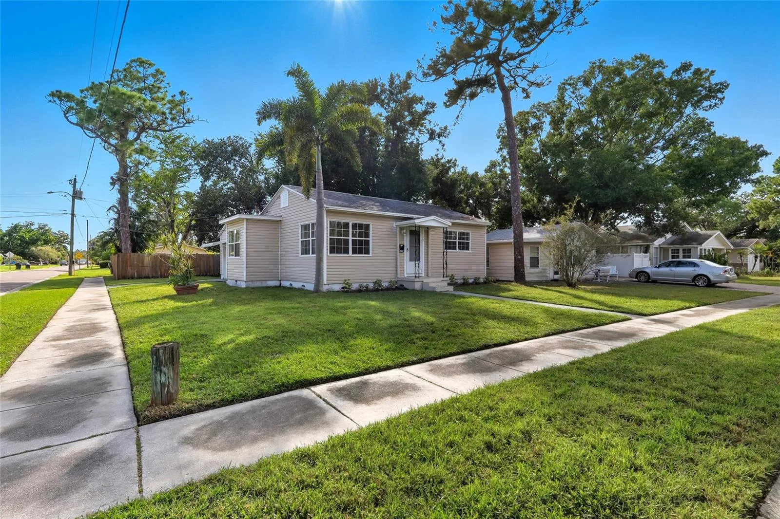 Welcome to an exceptional 3-bedroom, 1-bathroom, 1-car garage home on a premium corner lot with no HOA or CDD fees. This beautifully updated home in one of St. Pete’s most sought after neighborhoods offer’s the perfect blend of comfort, style, and function ! As you step up into the home you will first notice the fully renovated kitchen with brand new white shaker cabinets, Calcutta quartz countertops, a stylish tile backsplash and new stainless steel appliances. The bathroom features a tile shower/tub combo and a brand new 48” vanity with matching Calcutta quartz countertops. The rest of the home features high end luxury vinyl flooring and fresh paint on the entire interior including the ceilings. The third bedroom offers access to the backyard and can easily utilized as an office/flex space. Outside, the private fenced in backyard provides plenty of space for your furry friends along with additional storage with multiple sheds. Built high and dry this home suffered no hurricane related water damage, sure to offer peace of mind with the ever changing Florida weather. Located just minutes from downtown St. Pete, local parks, dining, and world-class beaches, homes like this are rarely available. Don’t miss out on this great opportunity !