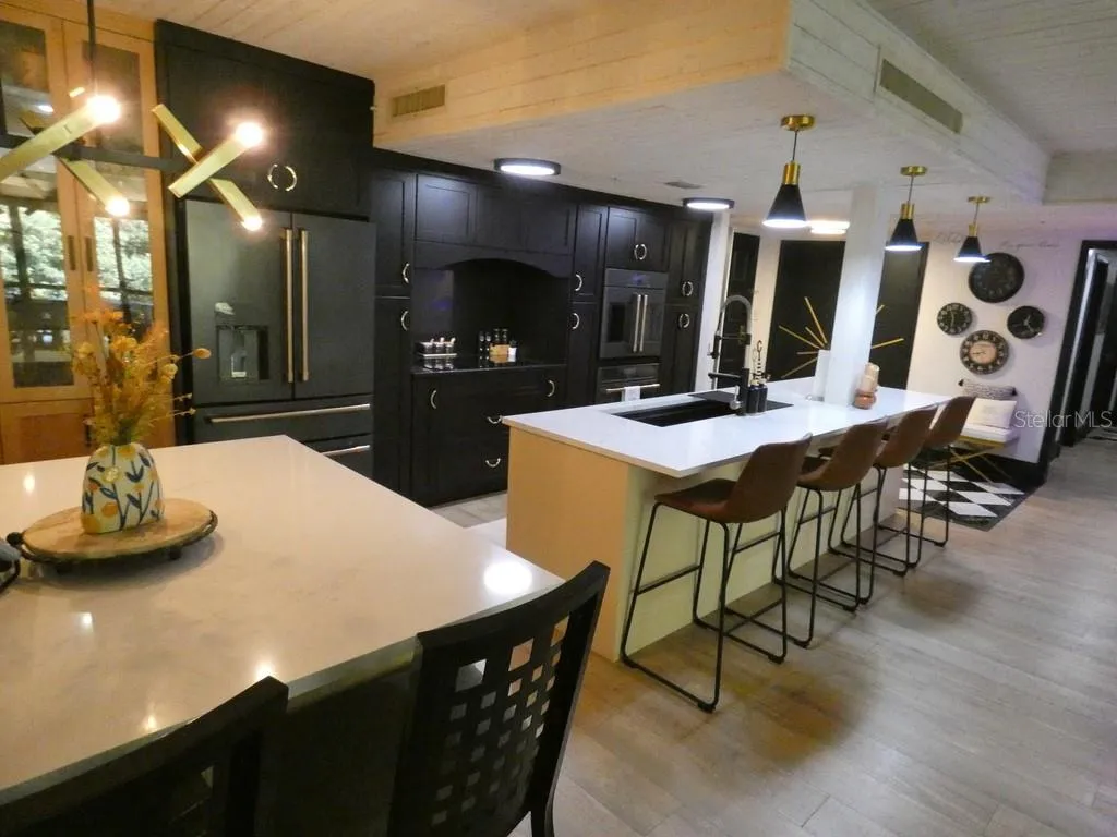 Nestled into the surrounding mature trees in The Innisbrook Golf and Tennis Resort you will enter this modern, moody loft condo that exudes all the urban charm with a dark, earthy edge. You will instantly view a spanning open-concept layout with all-encompassing natural light from floor to ceiling sliding doors. The matte black finishes against the warm tone flooring create an intimate, luxurious ambiance that will seat you directly on the comfortable, low- profile modern furnishings. A custom, modern dry bar set-up will seamlessly connect all your guests from kitchen to living areas and entertainment den. At the center of this loft condo is a custom gourmet kitchen designed for both form and function. The stained black cabinetry with two sprawling quartz islands and premium fixtures elevates the space for hosting intimate dinners of hand-crafted culinary delights to the most passionate of Foodies. It is a treasured haven for any aspiring French Baker as it is outfitted with GE Cafe Smart, Wi-Fi baking appliances. It becomes clear that storage is abundant throughout the kitchen spaces including a custom built floating buffet to house all the serving necessities.