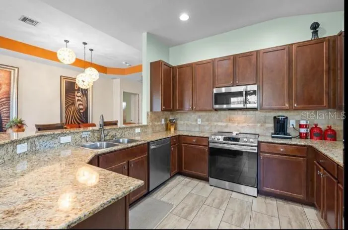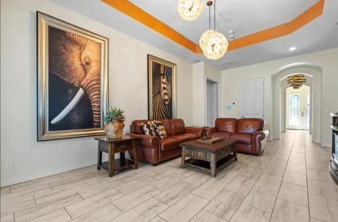 Inside, you’ll find soaring ceilings, an eye-catching foyer with designer lighting, and upgraded tile flooring throughout. The kitchen features granite countertops, newer stainless steel appliances, and a smart, open layout that flows into the living space.