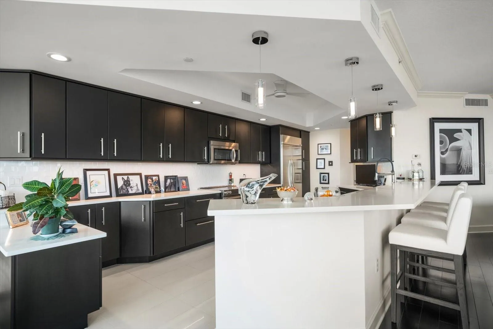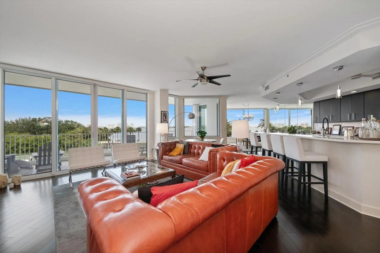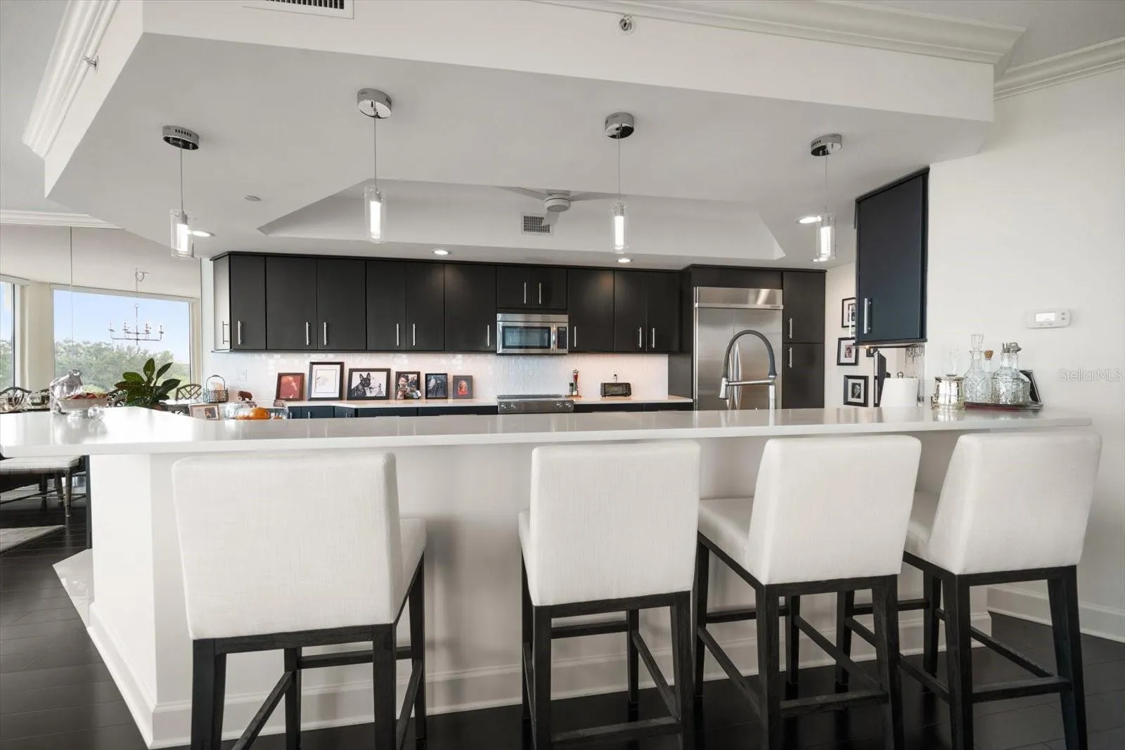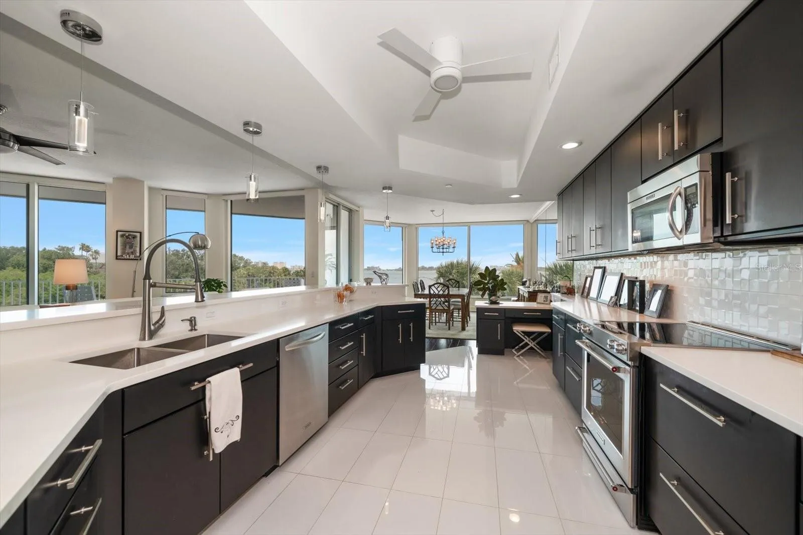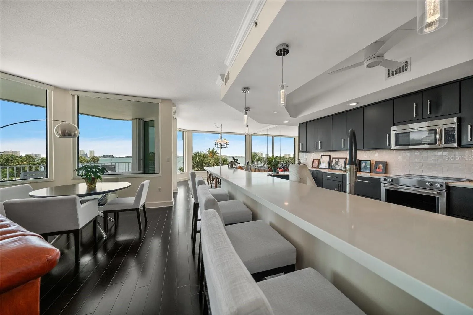 Discretely located behind the guarded gates of the prestigious Belleair Country Club, in the private and gated waterfront enclave of Seaside, this stunning second-floor condo offers elegance, security, and an enviable lifestyle. From the moment you enter the building, you’re welcomed by a beautifully appointed lobby that sets the tone for the refined living experience ahead. Double entry doors lead into a truly impressive residence, where rich wood floors, crown molding, and thoughtful designer details create a sense of warmth and sophistication. The open floor plan includes a spacious family room with sliders that open to a private balcony—perfect for sipping morning coffee, enjoying evening sunsets, or entertaining guests with the Intracoastal as your backdrop. The sleek, updated dine-in kitchen is a dream for any home chef, featuring stainless steel appliances, quartz countertops, a custom tile backsplash, a breakfast bar with pendant lighting, and a generous pantry. The adjacent dining room offers panoramic views of the Intracoastal, creating a stunning setting for everyday meals or formal gatherings. A convenient half bath adds to the functionality of the space. The split-bedroom layout provides ultimate privacy, with the impressive primary suite boasting a dedicated office nook, a walk-in closet, and a spa-like ensuite with a double sink vanity, jetted tub, and a spacious walk-in shower. The second bedroom is light-filled, offers ample closet space, and has its own private ensuite bath with a tub/shower combo. Additional highlights include a large interior storage room, remote-controlled blinds, hurricane shutters for peace of mind, a sparkling community pool, and secure under-building parking. Just a short drive to two private golf and country clubs, shopping, dining and sparkling beaches. With its prime location, resort-style amenities, and luxurious finishes, this condo offers the perfect blend of comfort, style, and security in one of Belleair’s most sought-after communities.