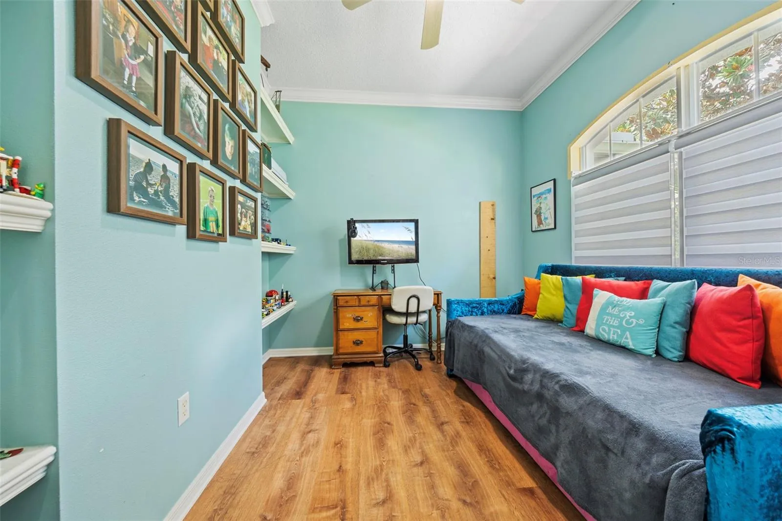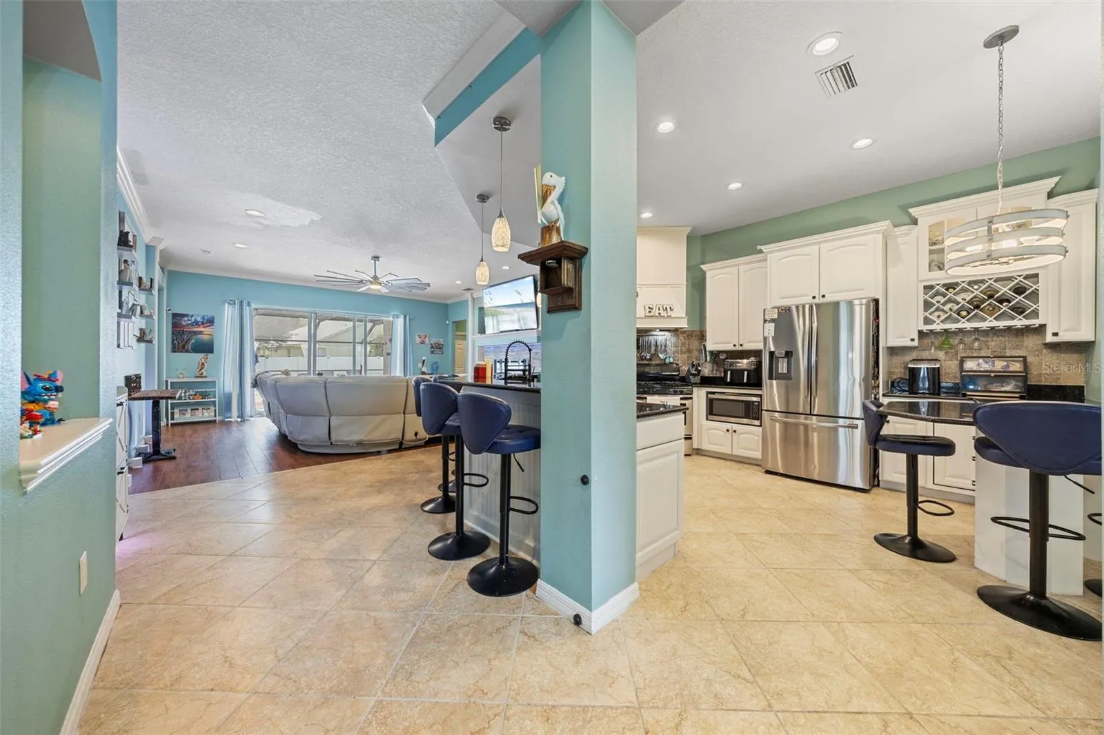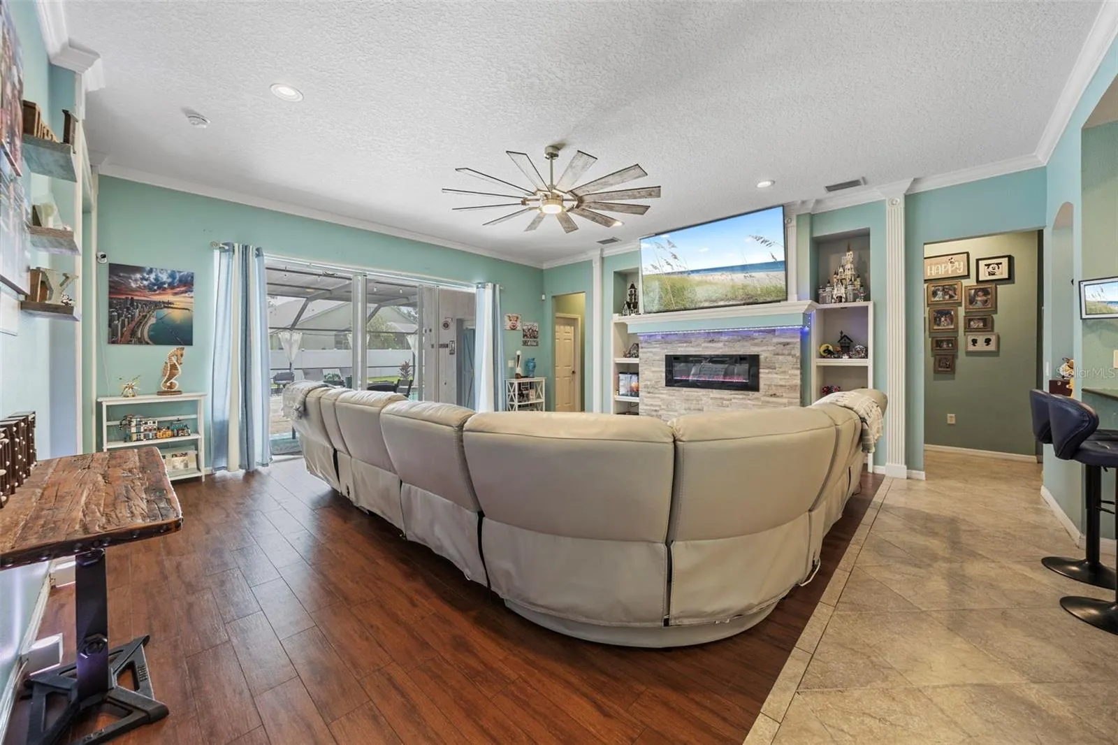 As you enter, you’re greeted by an abundance of natural light, rich crown molding, and a thoughtful, open layout designed for both entertaining and everyday living. The home features a formal dining room, a cozy family room, and a welcoming living room with an electric fireplace and large sliding glass doors that lead to your own private screened pool deck.
