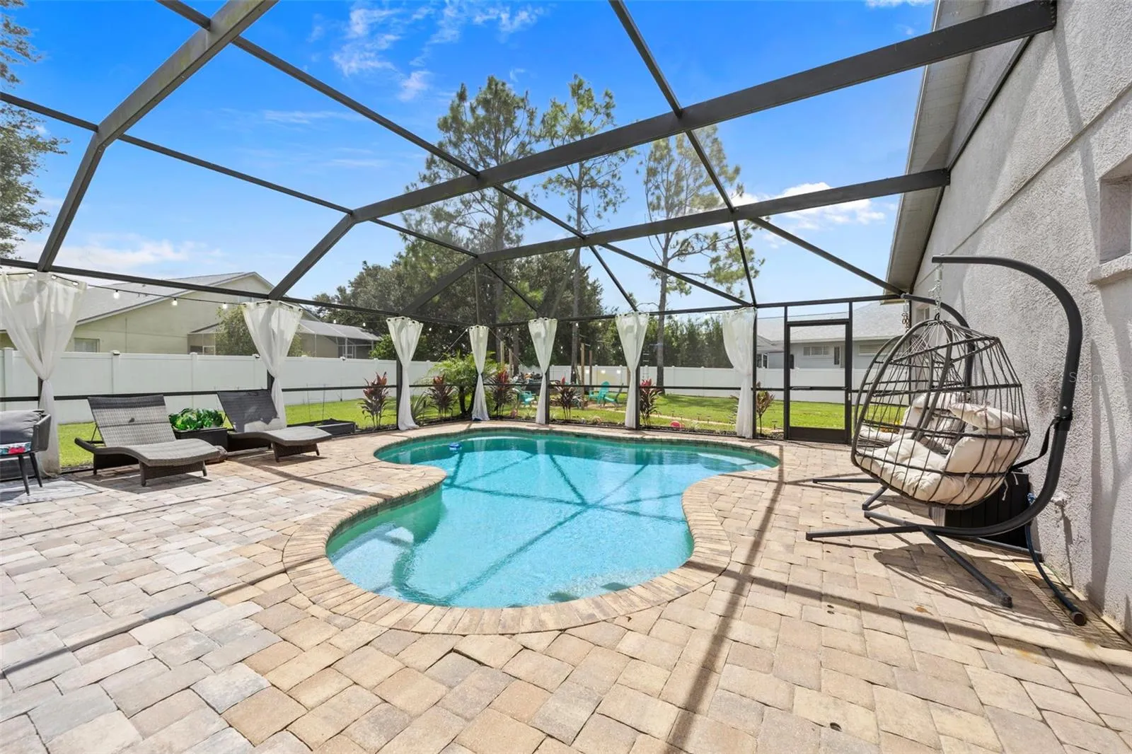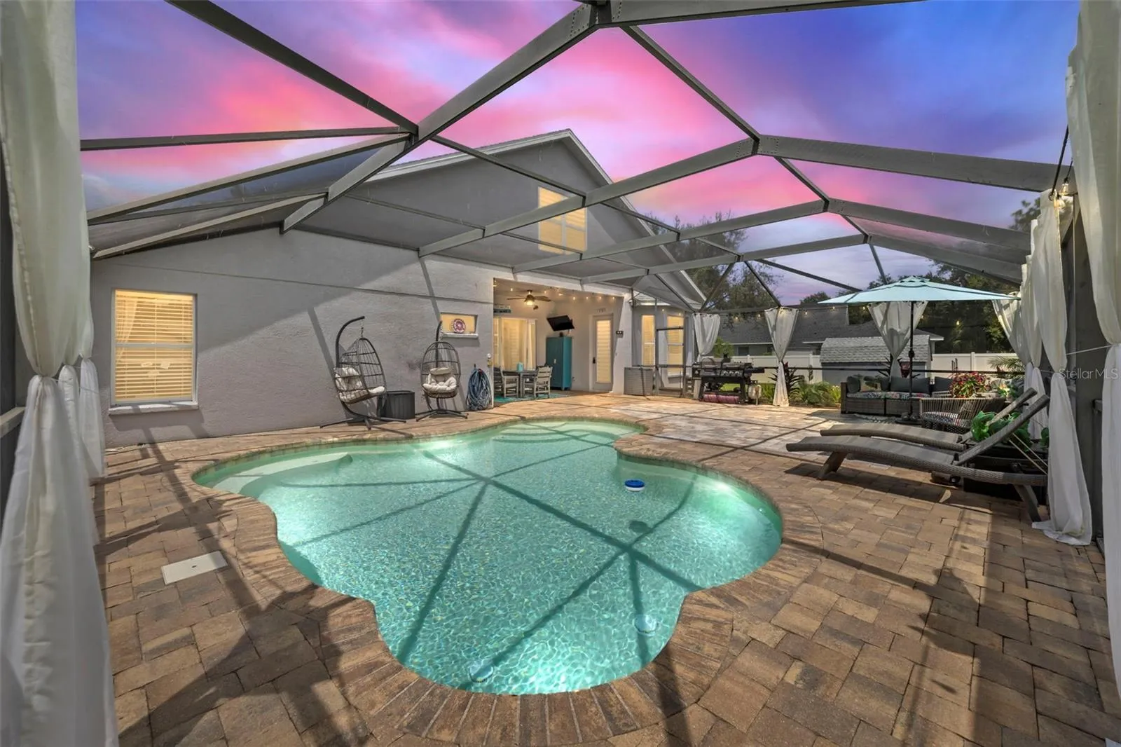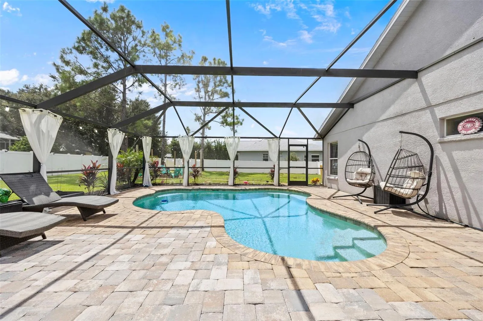Step outside to your private backyard oasis, complete with a rescreened lanai, sparkling heated pool, paver patio, and fire pit area—all within a fully fenced yard offering plenty of space for play, pets, or future additions.
