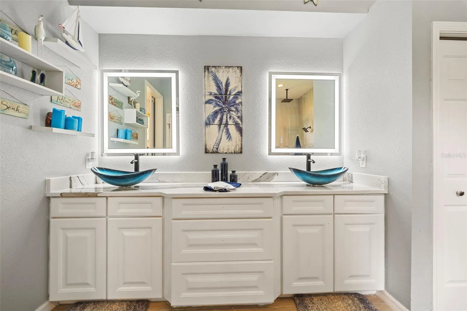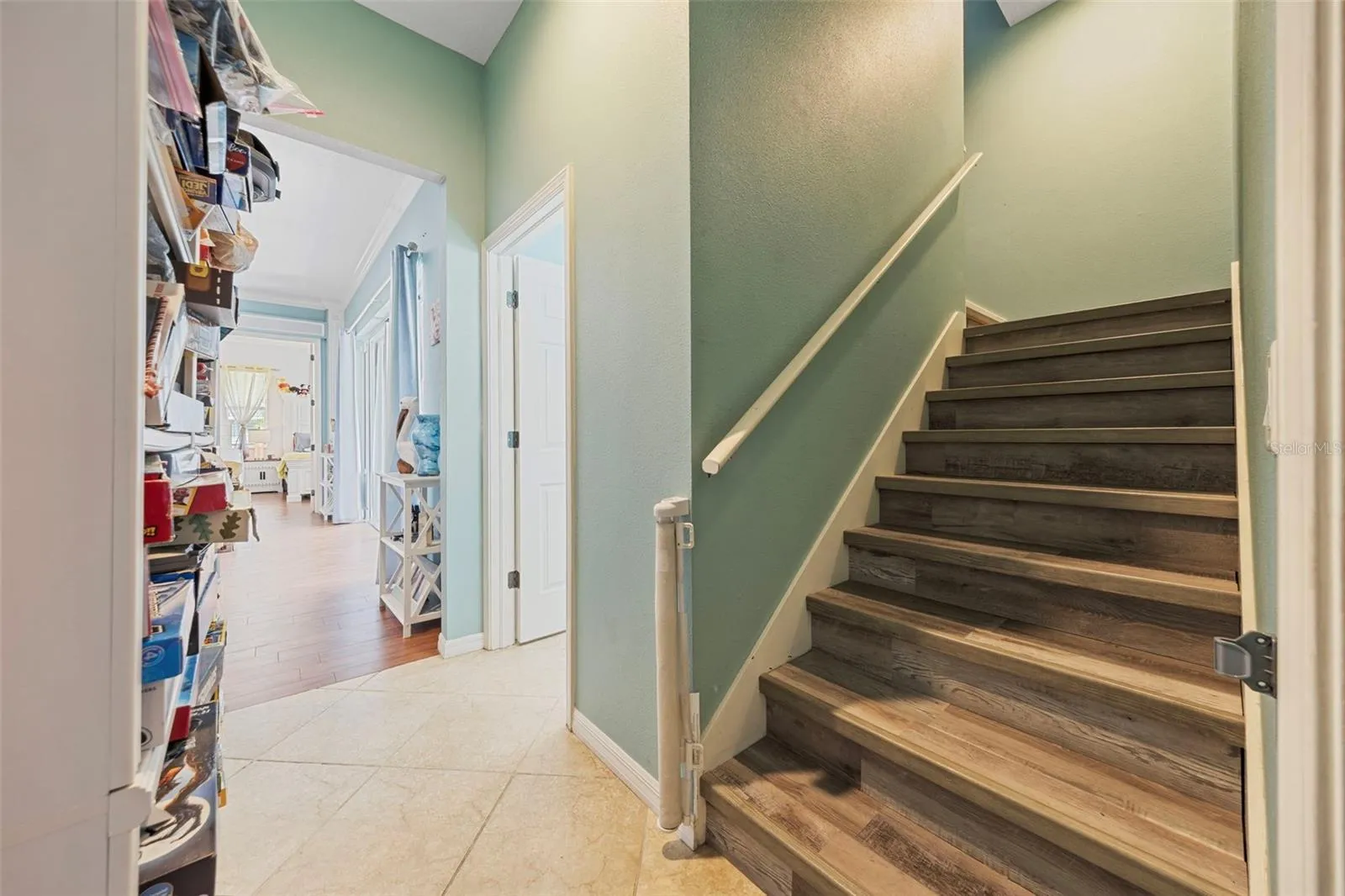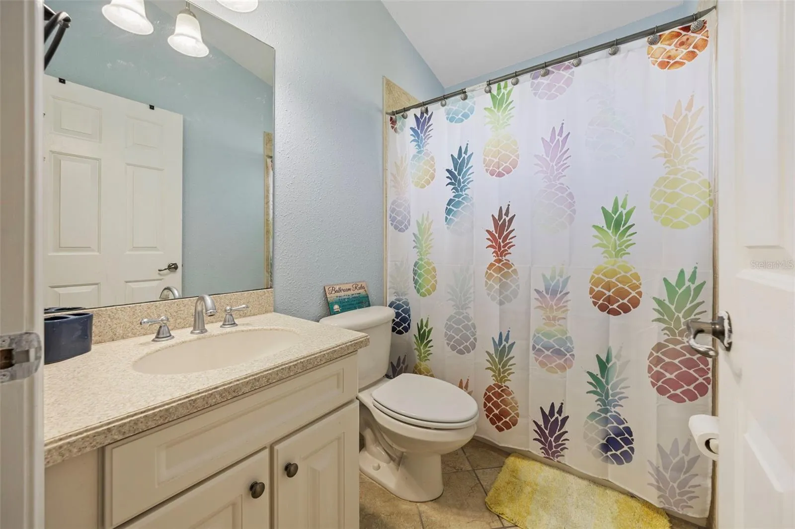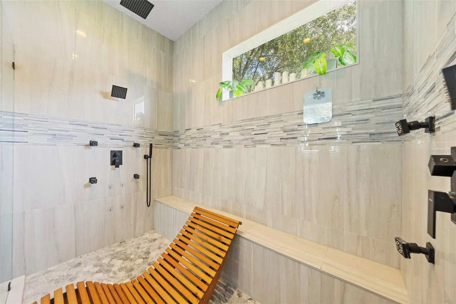The private owner’s suite is a true retreat, offering a sitting area overlooking the pool, a spa-like en suite bathroom with dual vanities, a dual-head walk-in shower with a built-in bench, a water closet, and an oversized walk-in closet. Two additional bedrooms on the first floor share a convenient Jack and Jill bathroom, while a half bath also provides easy access to the covered lanai.