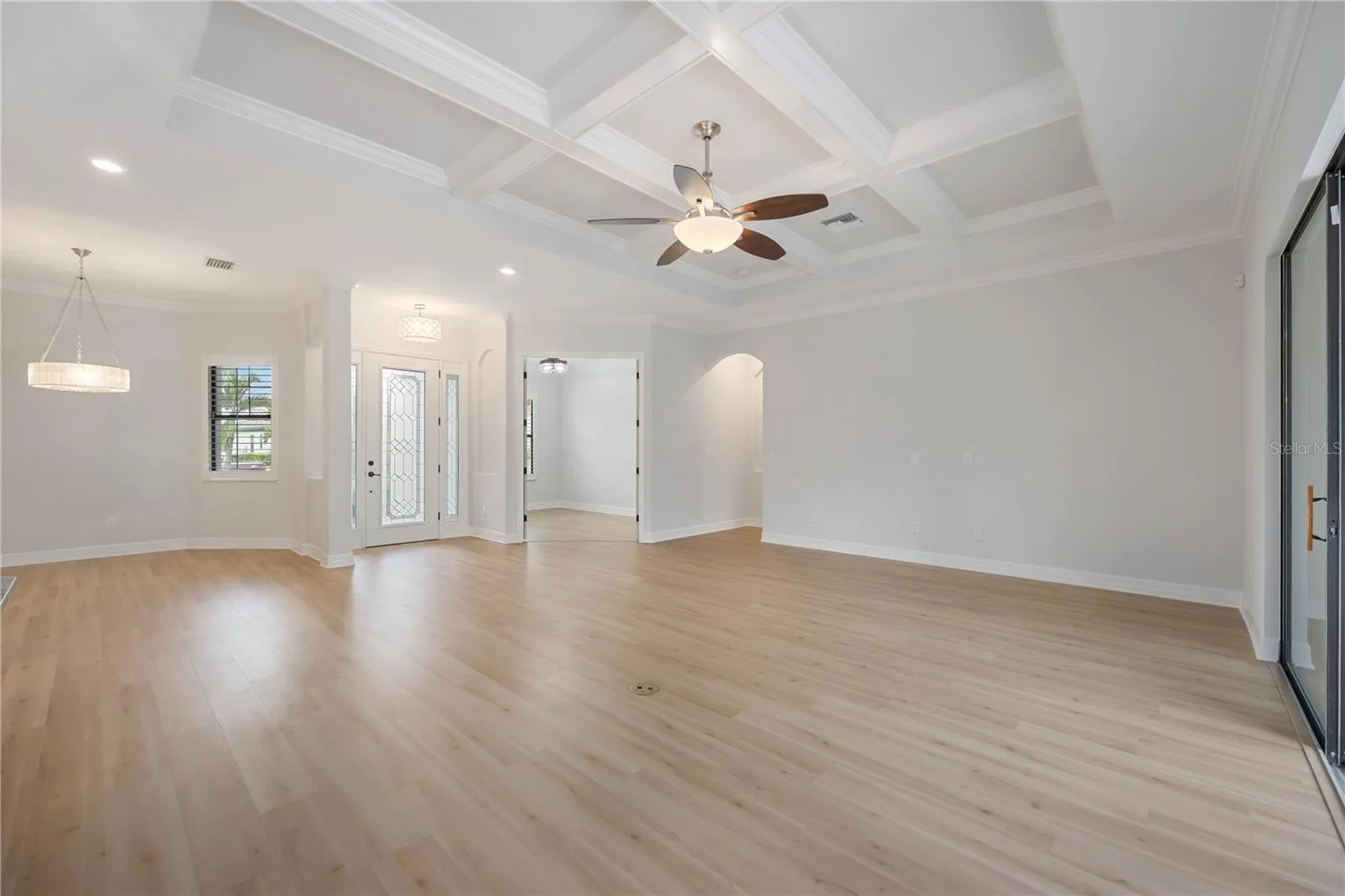 Step inside to a freshly painted interior with neutral vinyl plank flooring throughout, giving the home a clean, modern feel. The open floorplan makes the Oakmont model perfect for gathering with family and friends, and the coffered ceiling in the living room adds a special touch of charm.