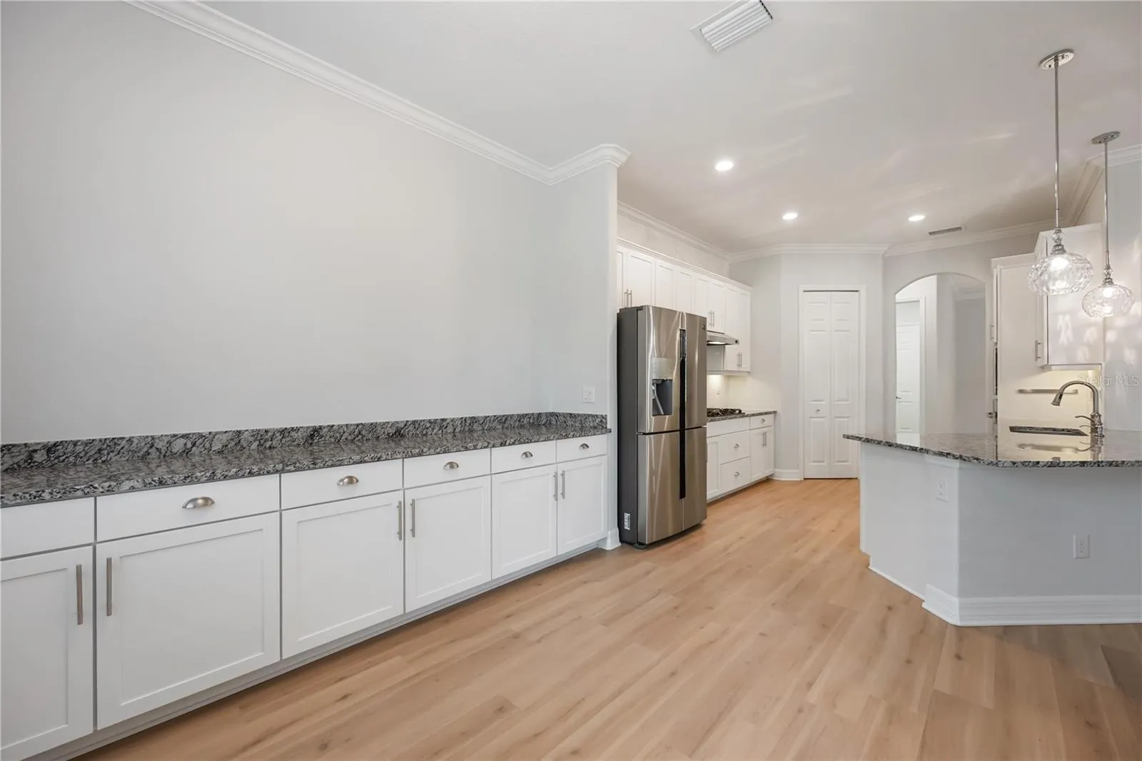 The kitchen area stands out–featuring granite countertops, stainless steel appliances, and an extended bar area that offers additional storage and counter space.