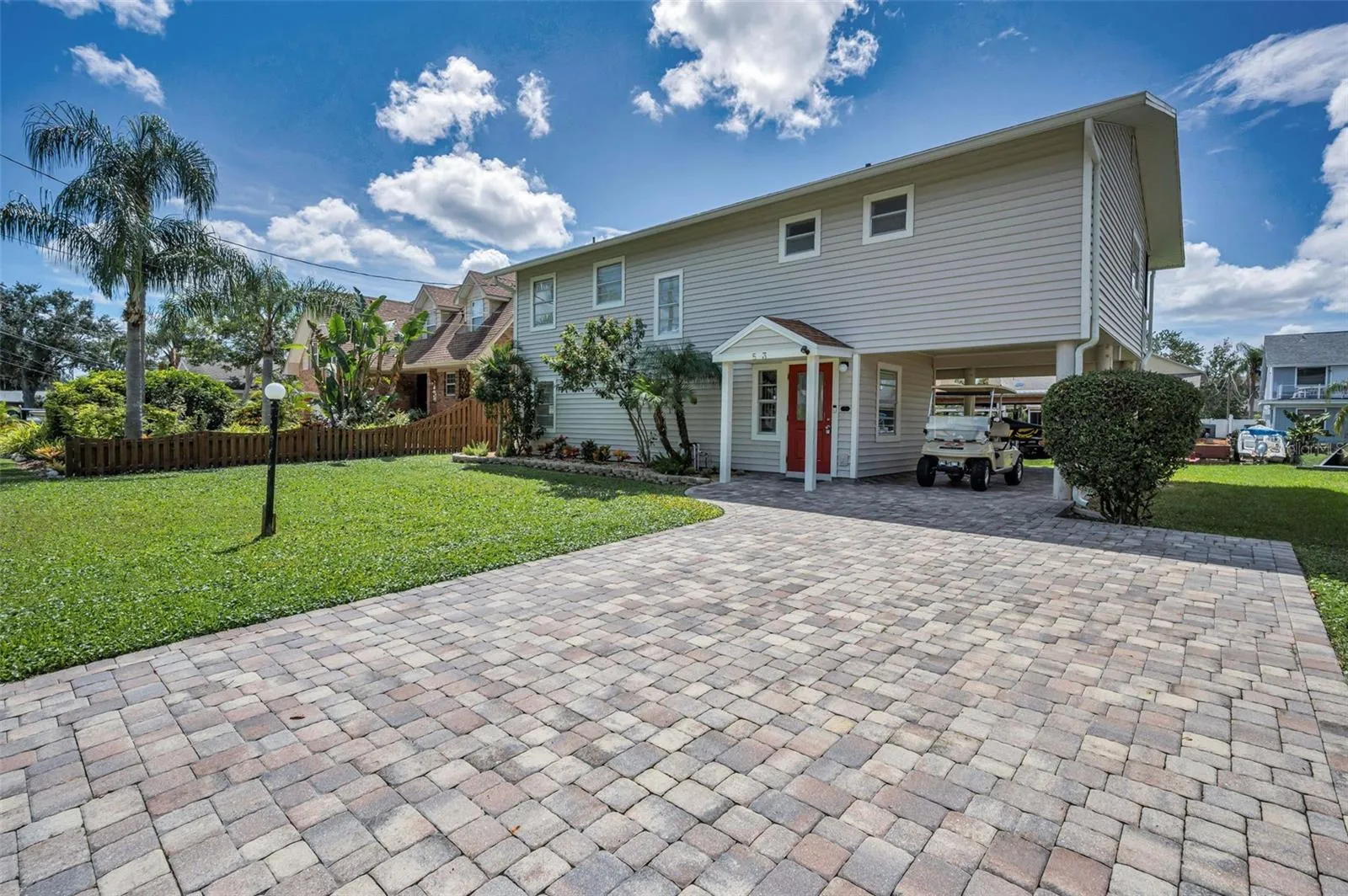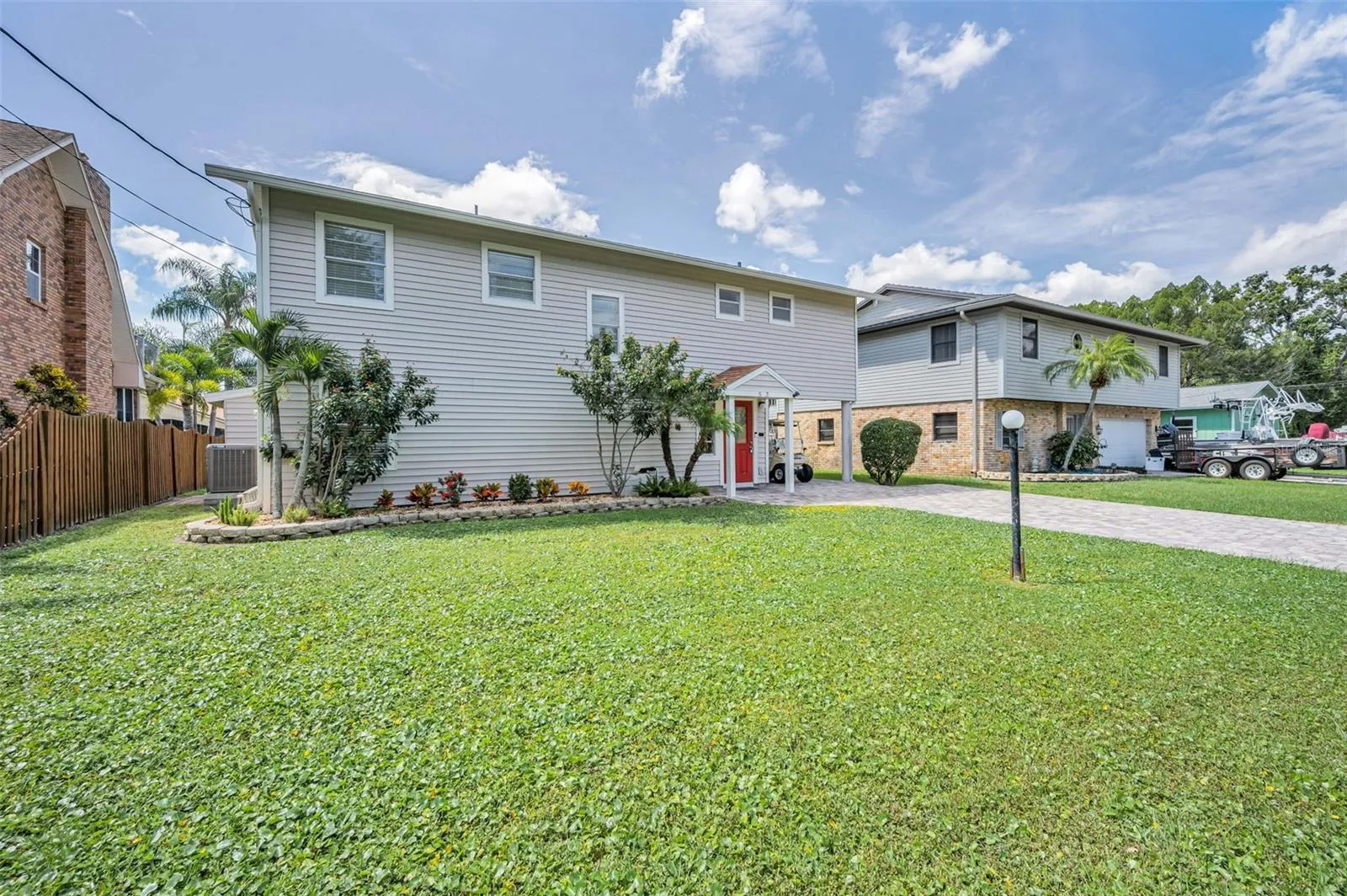 Welcome to this beautifully updated three-bedroom, two-and-a-half bath home on the shores of Lake Tarpon. From the moment you arrive, the paver-lined exterior, lovely landscaping, and inviting entry foyer set the tone for a property that balances comfort, flexibility, and waterfront living.