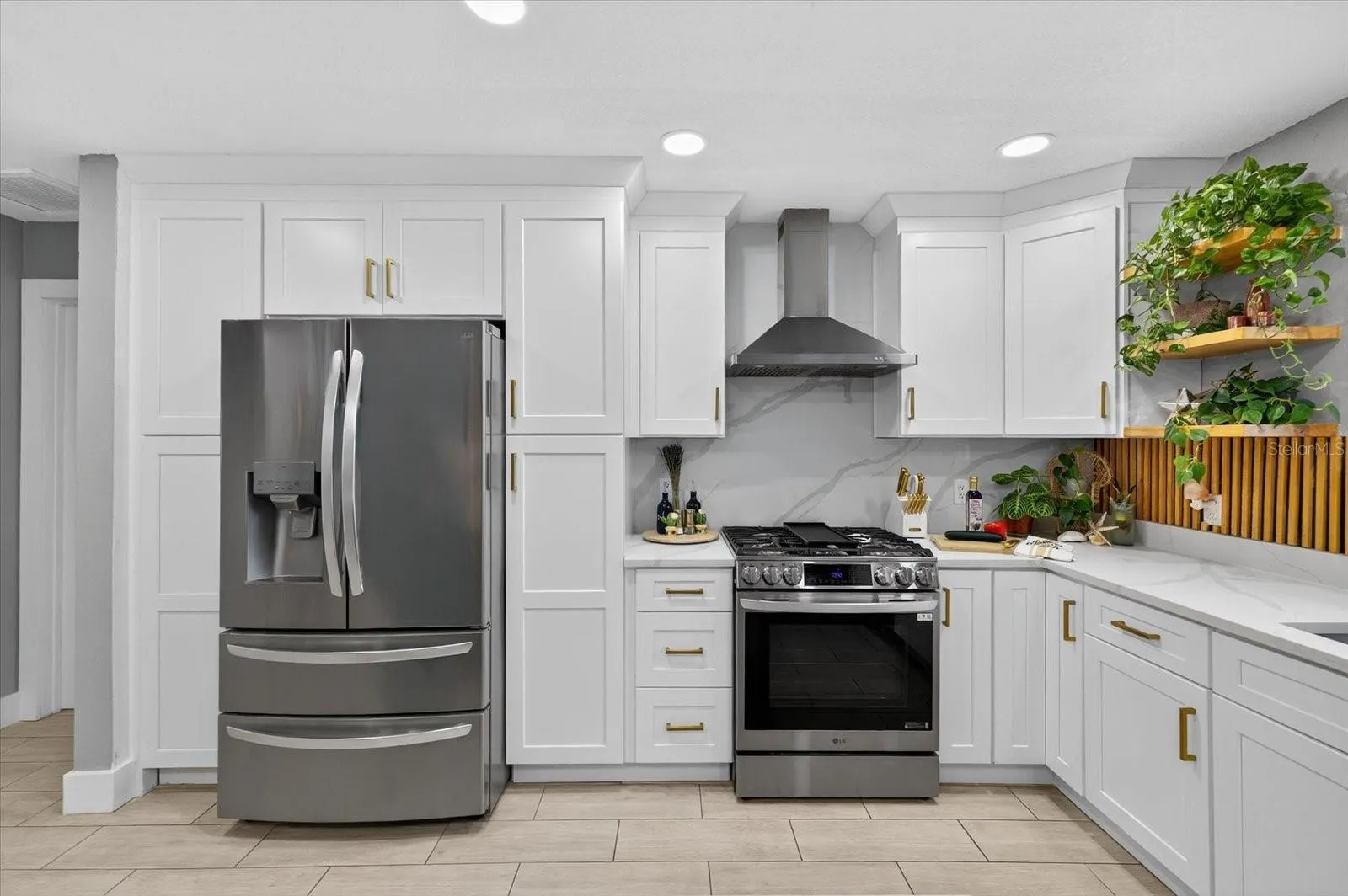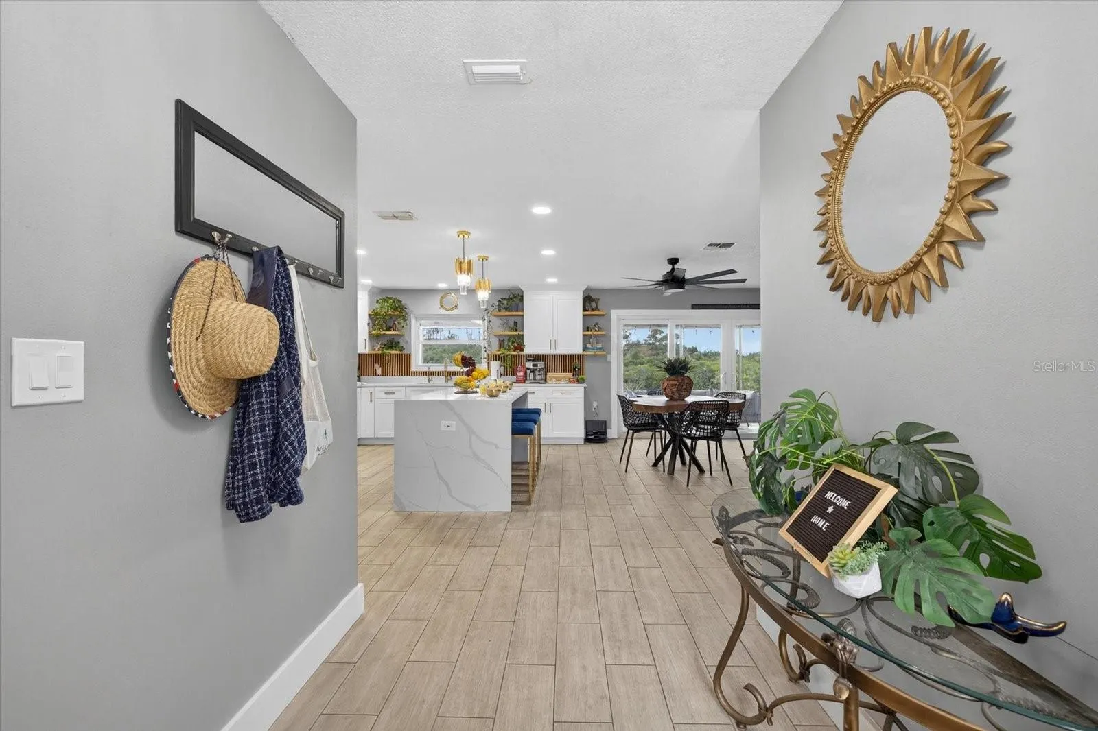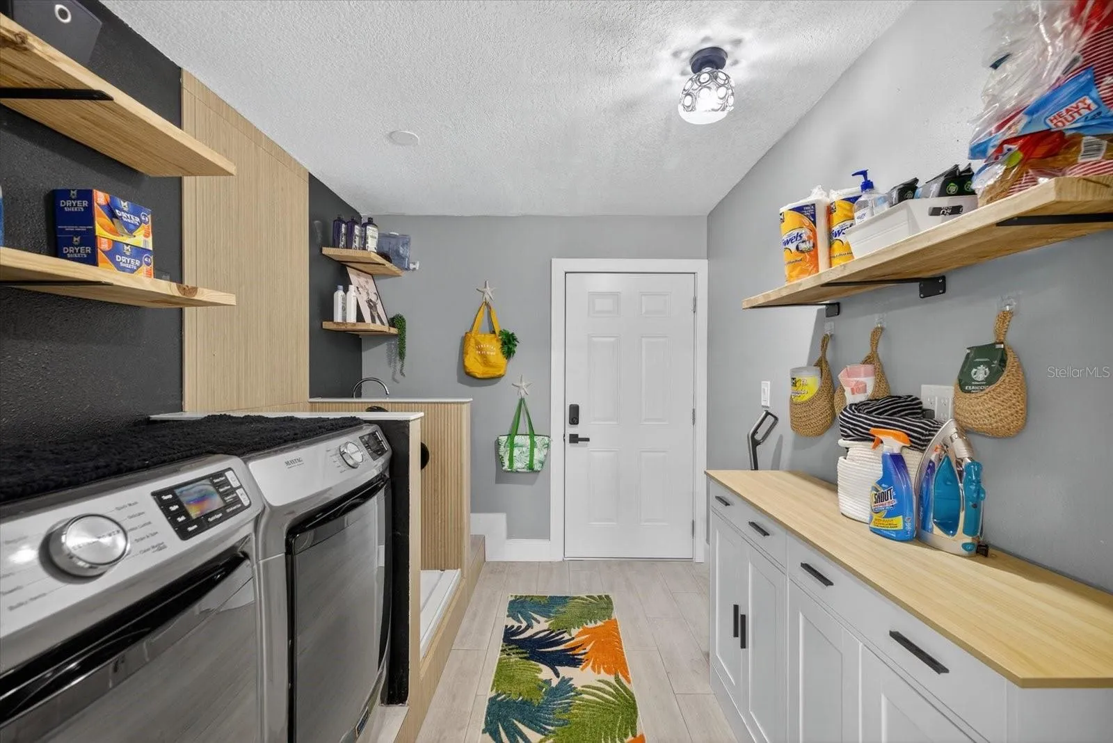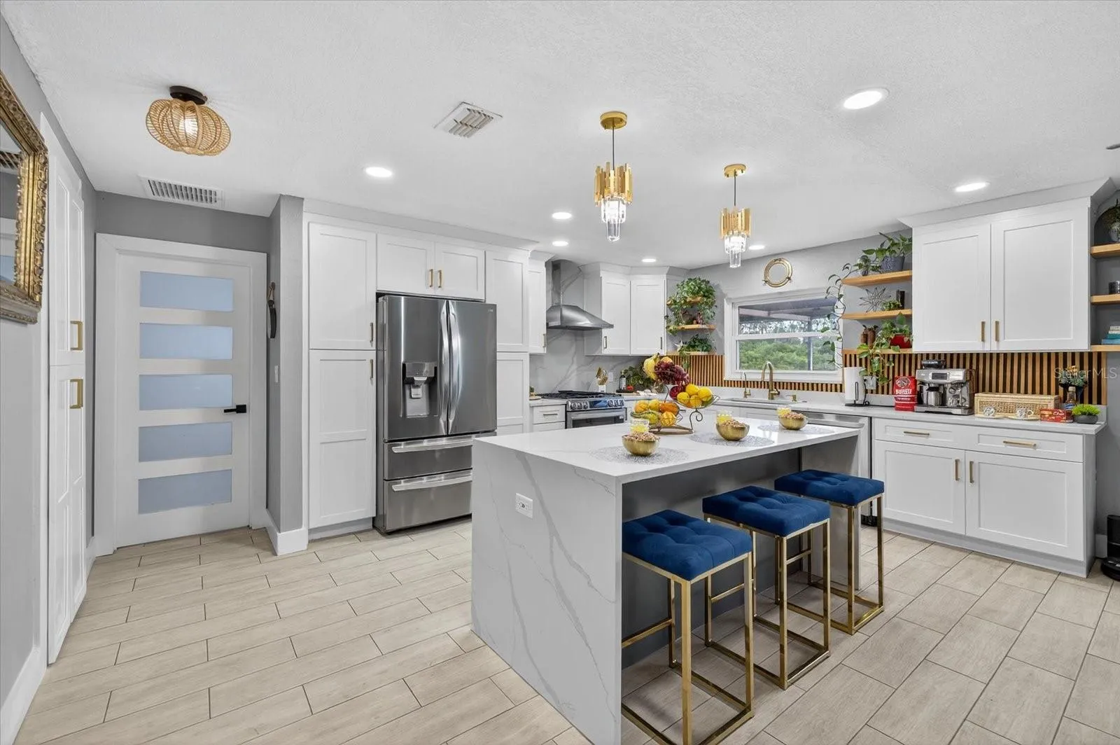 Step inside to a wide-open floor plan dressed in plank tile flooring and filled with natural light. The kitchen is a true show stopper—outfitted with soft-close solid wood shaker cabinetry, brass accents, LG WiFi stainless appliances, a gas cooktop with center griddle, air fryer oven, stone backsplash that reaches the ceiling, and a stunning waterfall island complete with a trendy microwave drawer. Dual pantries surround the refrigerator, and just off the kitchen you’ll find a cabinet hidden mudroom and indoor laundry space with floating shelves, a utility sink, and even a dog shower—a thoughtful touch for modern easy living.