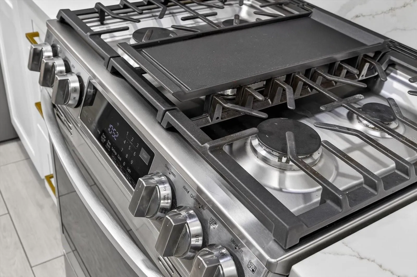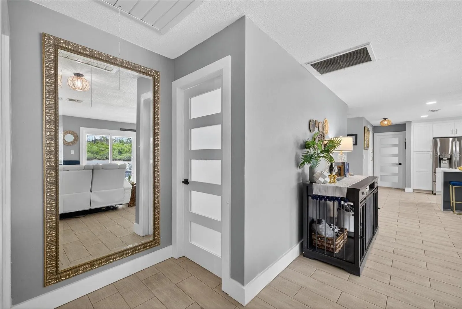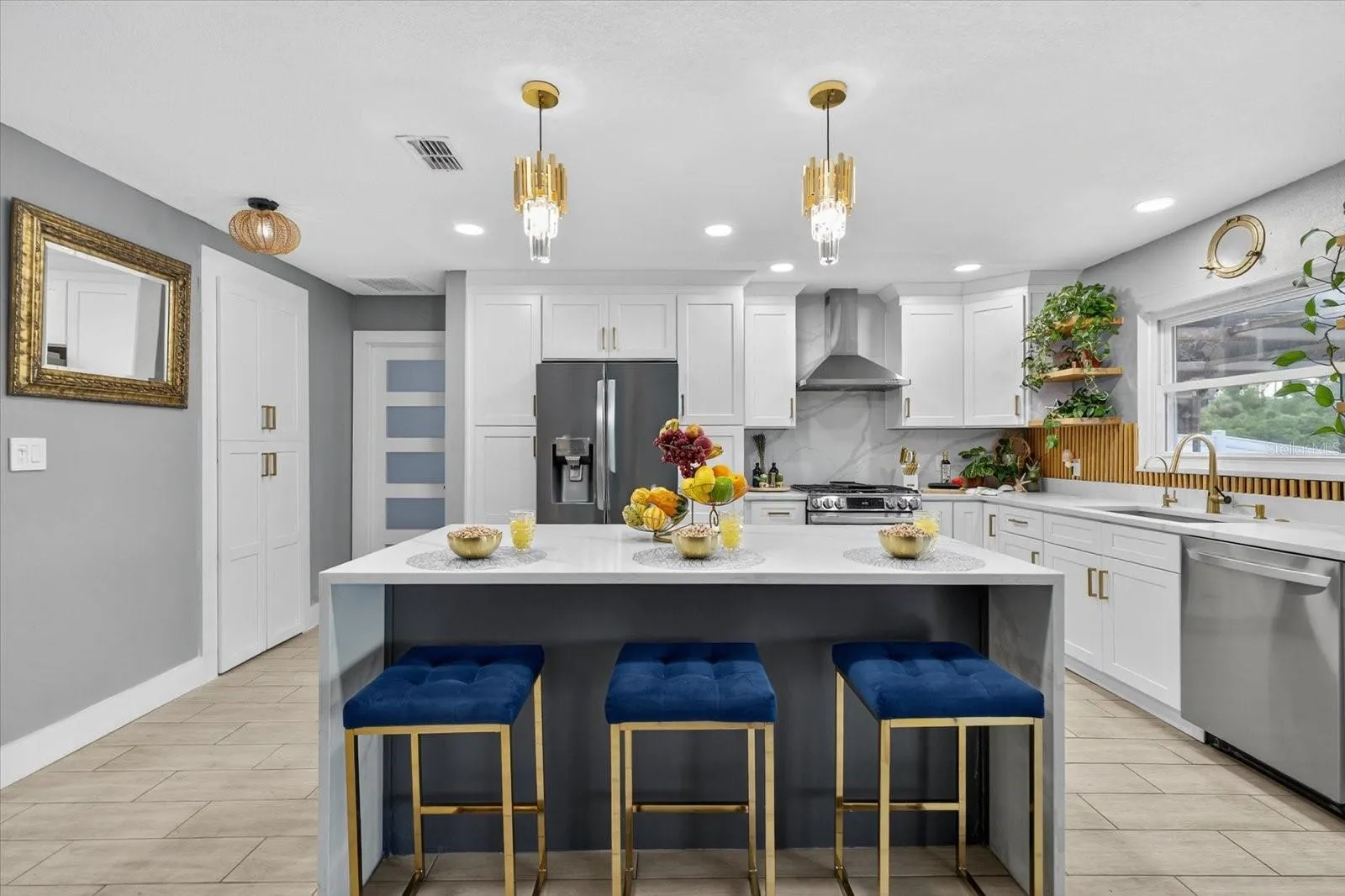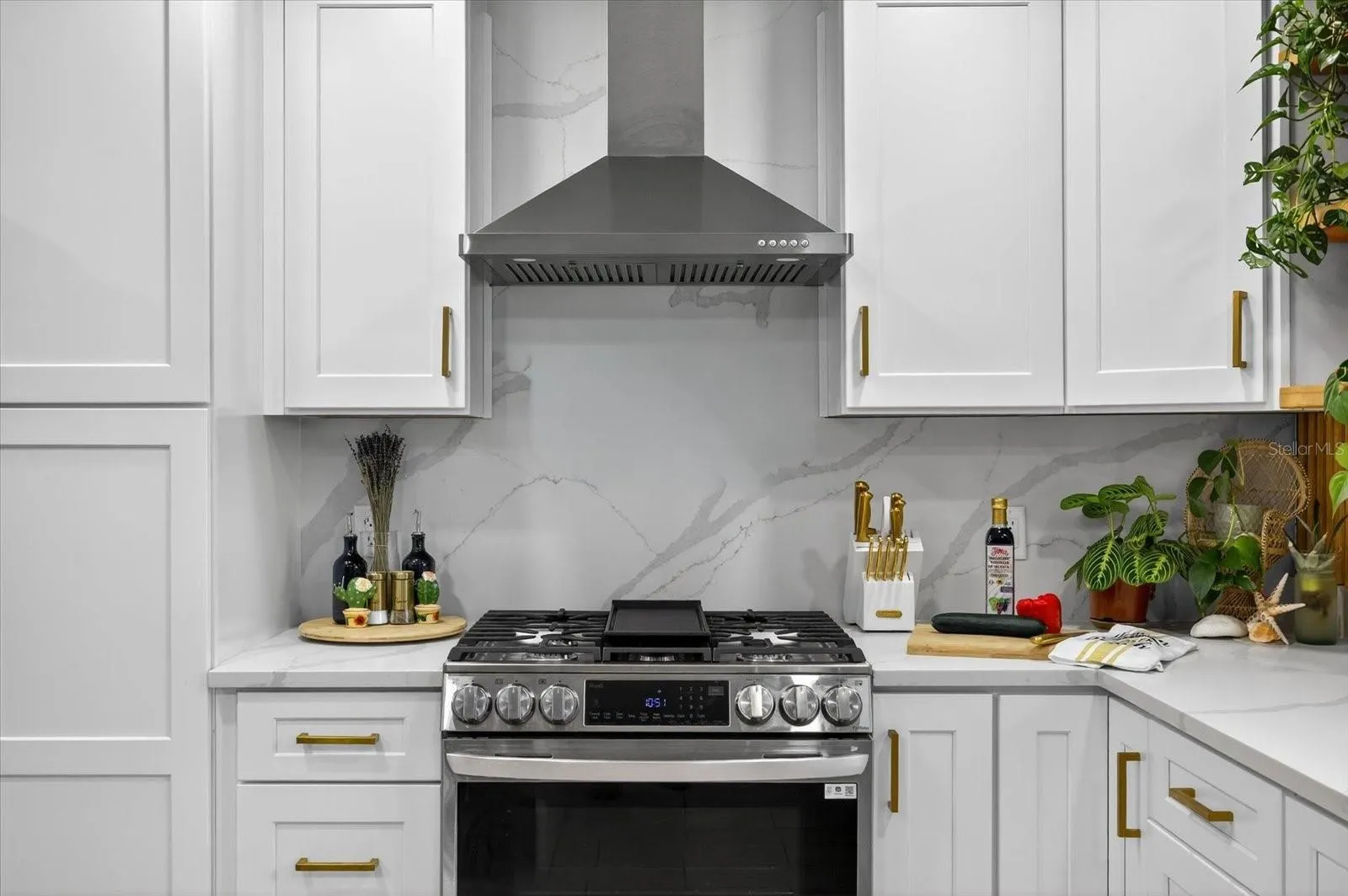 Step inside to a wide-open floor plan dressed in plank tile flooring and filled with natural light. The kitchen is a true show stopper—outfitted with soft-close solid wood shaker cabinetry, brass accents, LG WiFi stainless appliances, a gas cooktop with center griddle, air fryer oven, stone backsplash that reaches the ceiling, and a stunning waterfall island complete with a trendy microwave drawer. Dual pantries surround the refrigerator, and just off the kitchen you’ll find a cabinet hidden mudroom and indoor laundry space with floating shelves, a utility sink, and even a dog shower—a thoughtful touch for modern easy living.