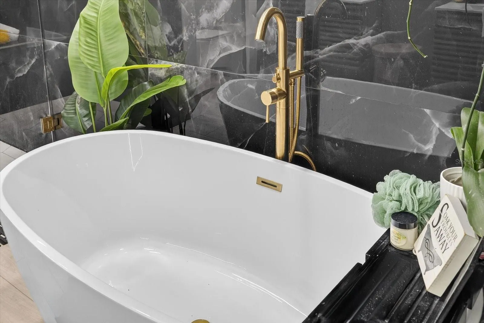The primary suite offers both a walk-in and secondary closet, along with water and pool views and a sleek ensuite featuring a his-and-hers floating vanity, a walk-in shower, and private water closet. The real showstopper is tucked behind a hidden door: a Hard Rock Hotel-inspired spa-like bathroom complete with a walk-in steam shower with wall jets, dual shower heads, mosaic ceiling tile, soaking tub, double vanities, and floating toilet in the private water closet.
