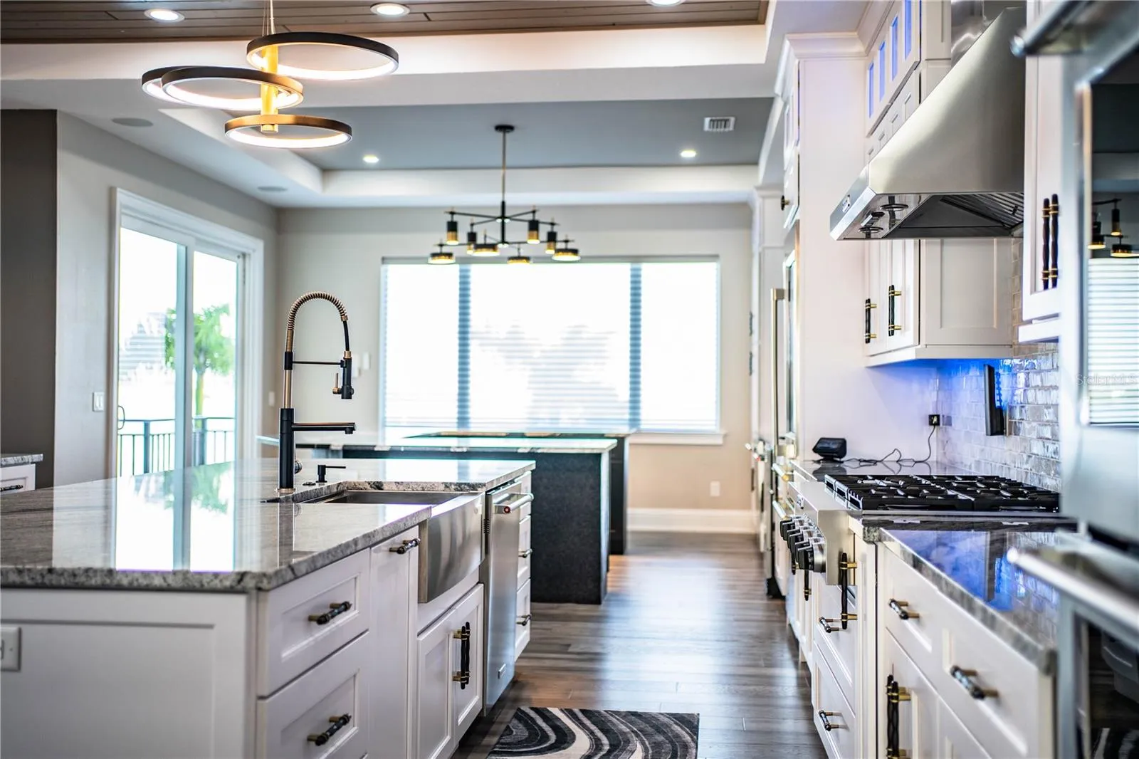 If you are you looking for open water, you’ve found it on Boca Ciega Bay. Boasting a 30,000 lb high speed boat lift with composite decking, and a step down for easy boat access. When you’re not out boating, enjoy fishing off your dock as dolphin and manatee swim-by. Ground level includes heated pool and attached spa and water features. Enjoy sitting around a large stone-built gas fire-pit, surrounded by artificial turf and mature palm trees. Let’s begin on the ground level; this property comes with a brand-new outdoor kitchen, equipped with new ice maker, refrigerator, granite countertops and seating for up to 12. All cabinets are outdoor rated. There’s more; an additional kitchen area with a gas grill-top BBQ. Sonos speakers carry the music all the way to the dock.
