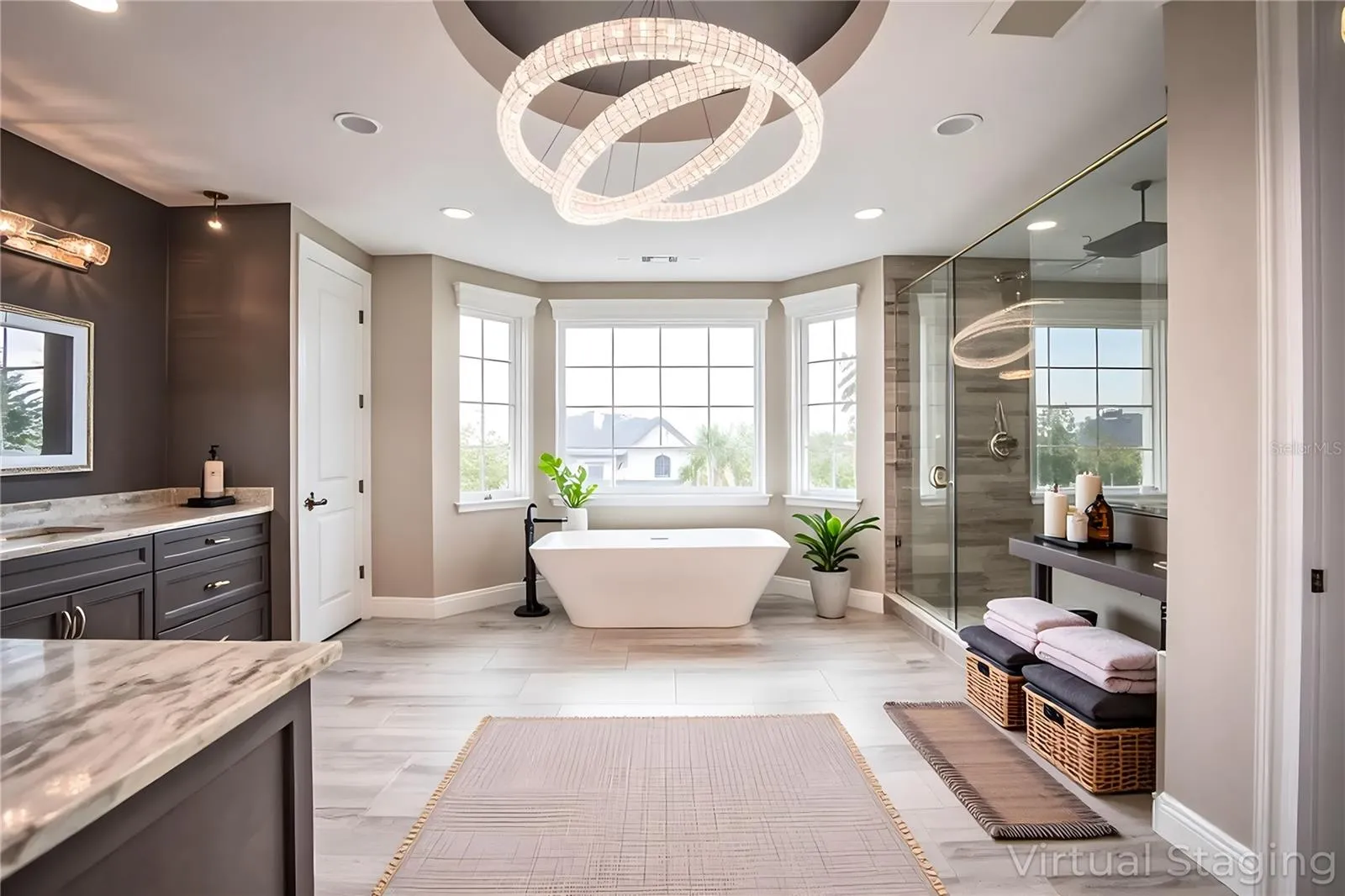 Time to enter through the front door……designer custom steel doors leading to the foyer, additional storage and elevator service. On the 2nd level, the view begins! There’s 4-sliders with two 8′ high glass panels on both sides, affording a panoramic open-water view of Boca Ciega Bay! To the left you will find a custom wall with a 98″ electric fireplace coupled with a 98″ TV and a Sonos sound system; this great room is outrageous. In the center of the room, there’s ample space for a dining table that seats 8, with a custom contemporary chandelier. Further to the right, is a large kitchen boasting two 10′ islands!