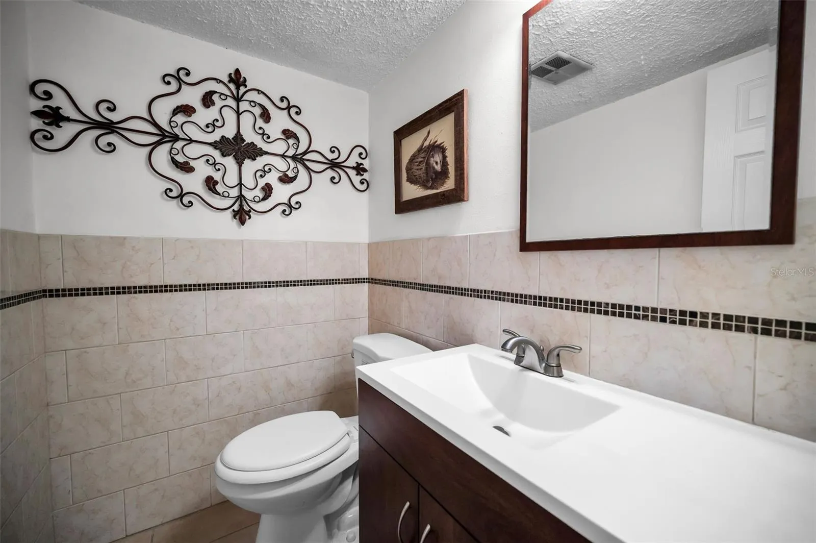 The kitchen features wood cabinets, granite countertops, stainless steel appliances, tile flooring, and a stylish tile backsplash. An updated half bath completes the main level.