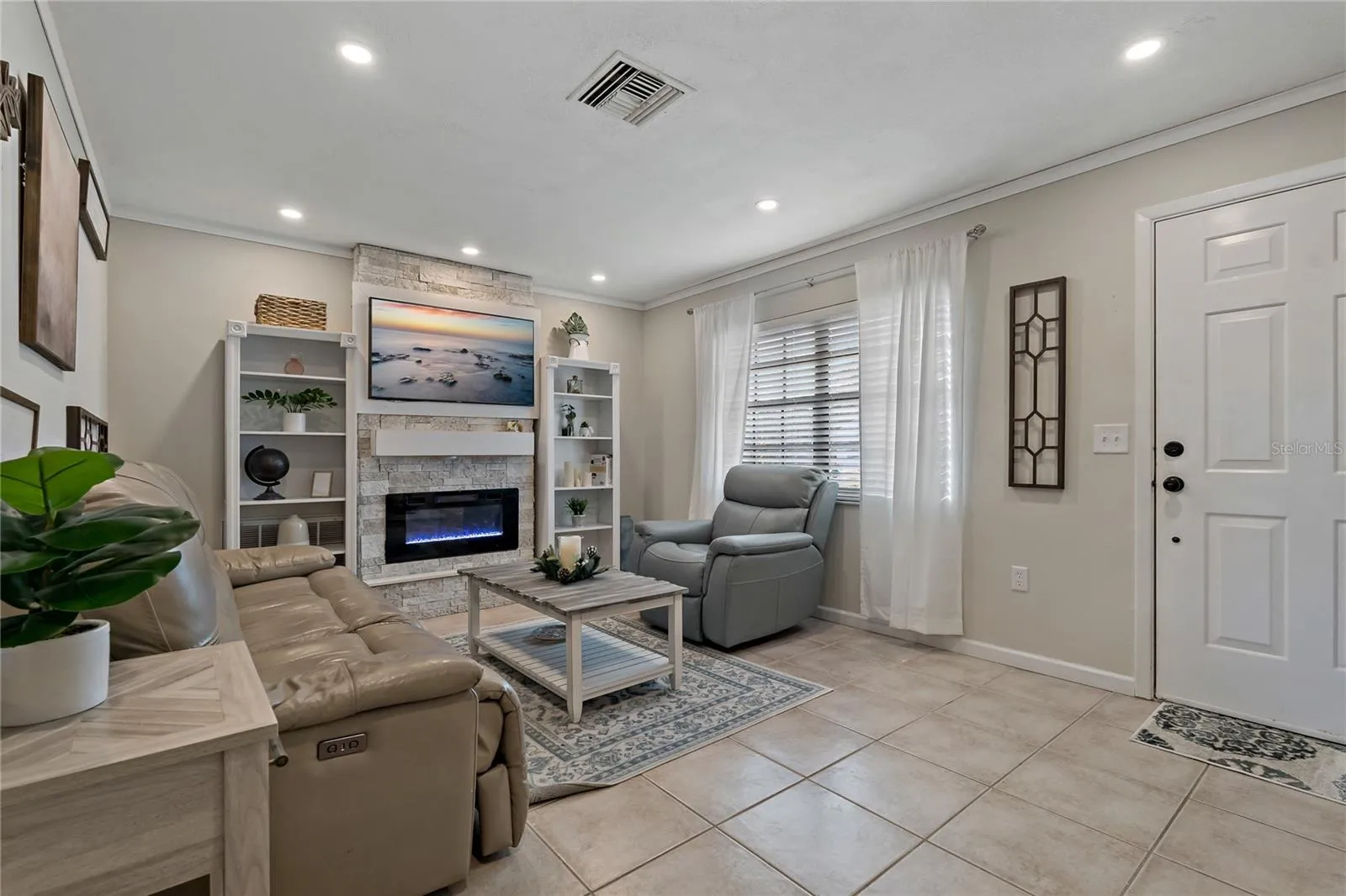 This residence blends modern updates with versatile living. The 2017 roof, 2019 A/C, newer hot water heater, and a freshly painted exterior provide lasting peace of mind. Inside, the home showcases a remodeled kitchen with granite countertops, oversized bar seating, new stainless steel appliances, and updated fixtures. Both bathrooms have been fully refreshed with new vanities, toilets, lighting, and updated tile/shower finishes. Upgrades continue with a newly installed California-style closet, custom-built fireplace, recessed lighting throughout, and a Bluetooth-enabled sound system.