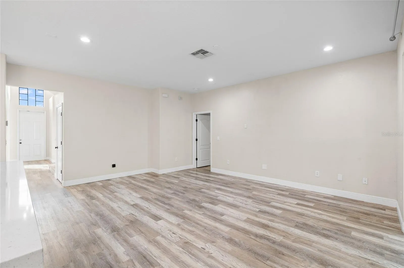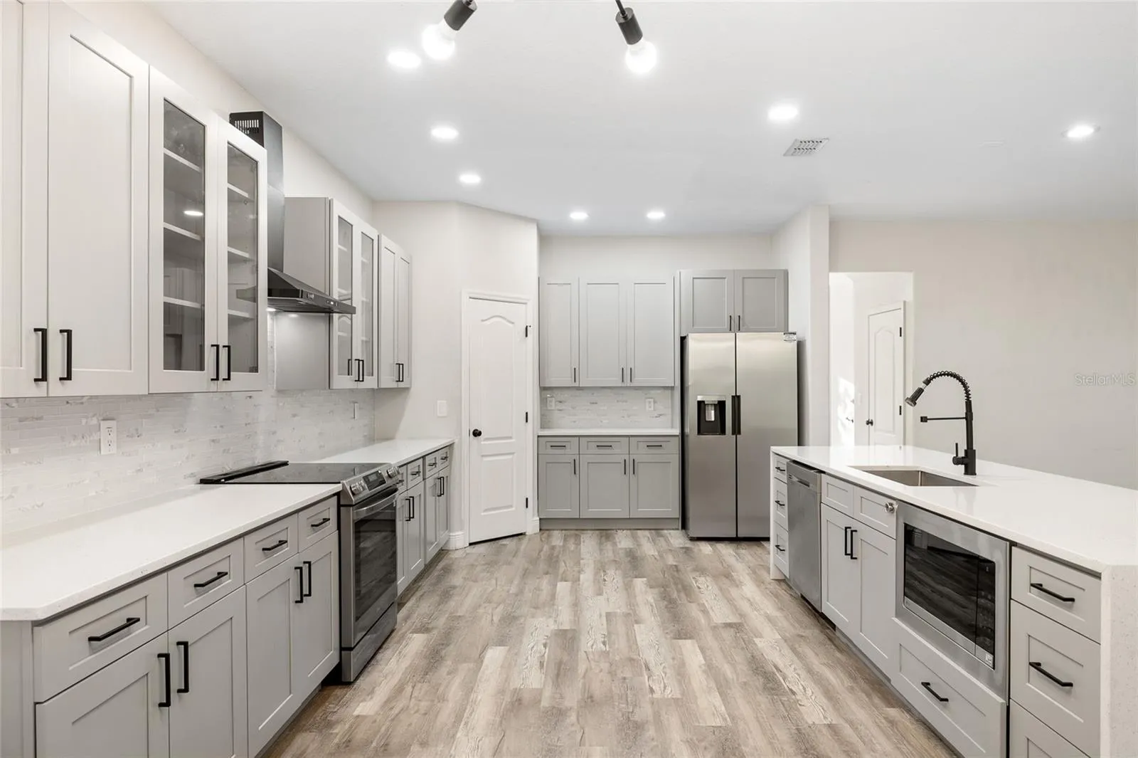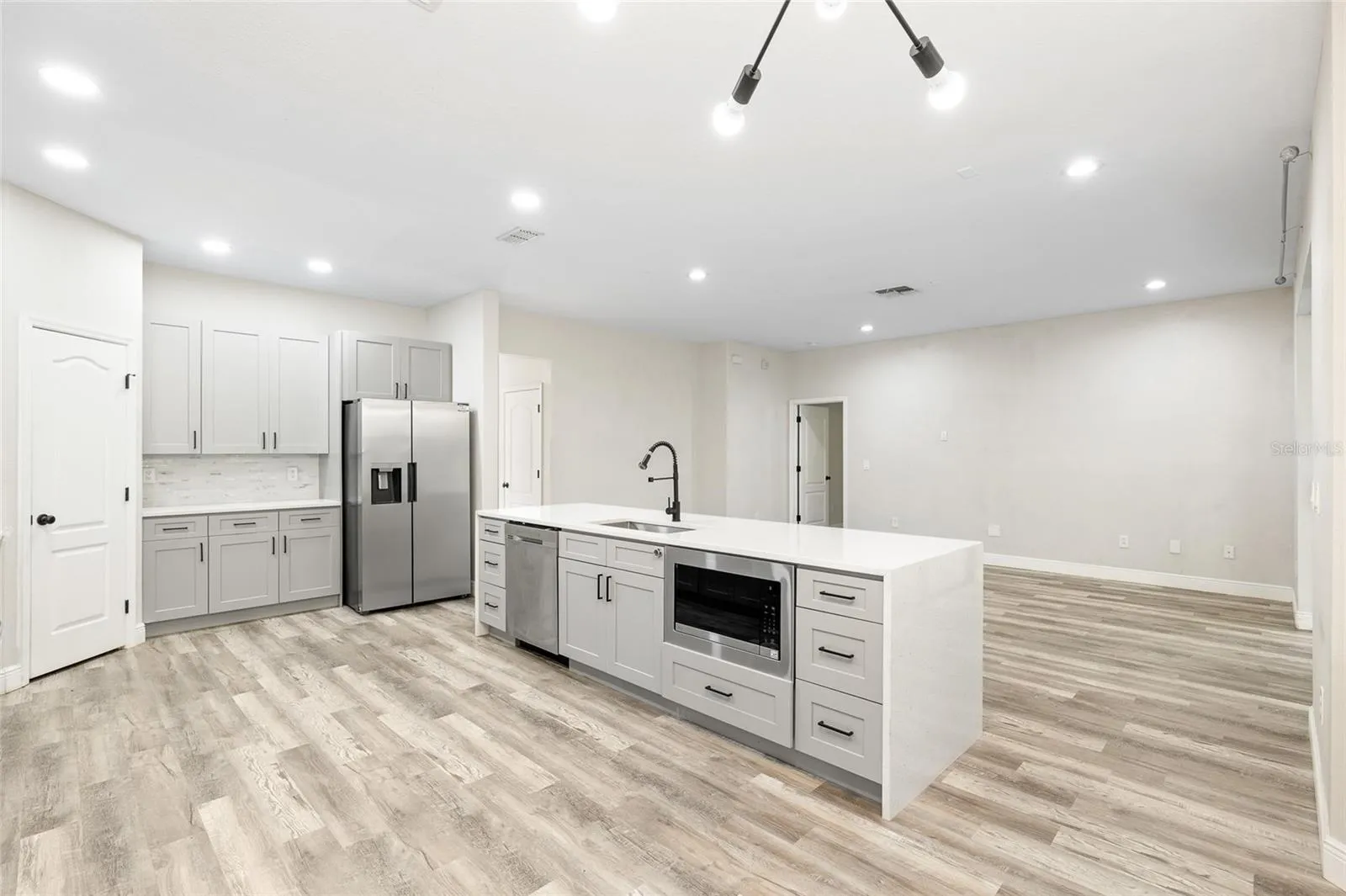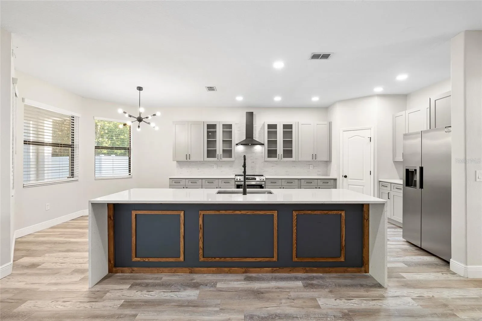 Step inside to an impressive open layout with formal living and dining areas—ideal for entertaining or family gatherings. At the heart of the home is a gourmet kitchen featuring elegant quartz countertops, a massive 72-inch island with farmhouse-style accents, sleek gray soft-close shaker cabinetry, and a premium stainless-steel appliance package (2022). The kitchen flows seamlessly into the expansive family room, where large sliders open to a spacious covered patio—perfect for outdoor dining and entertaining.