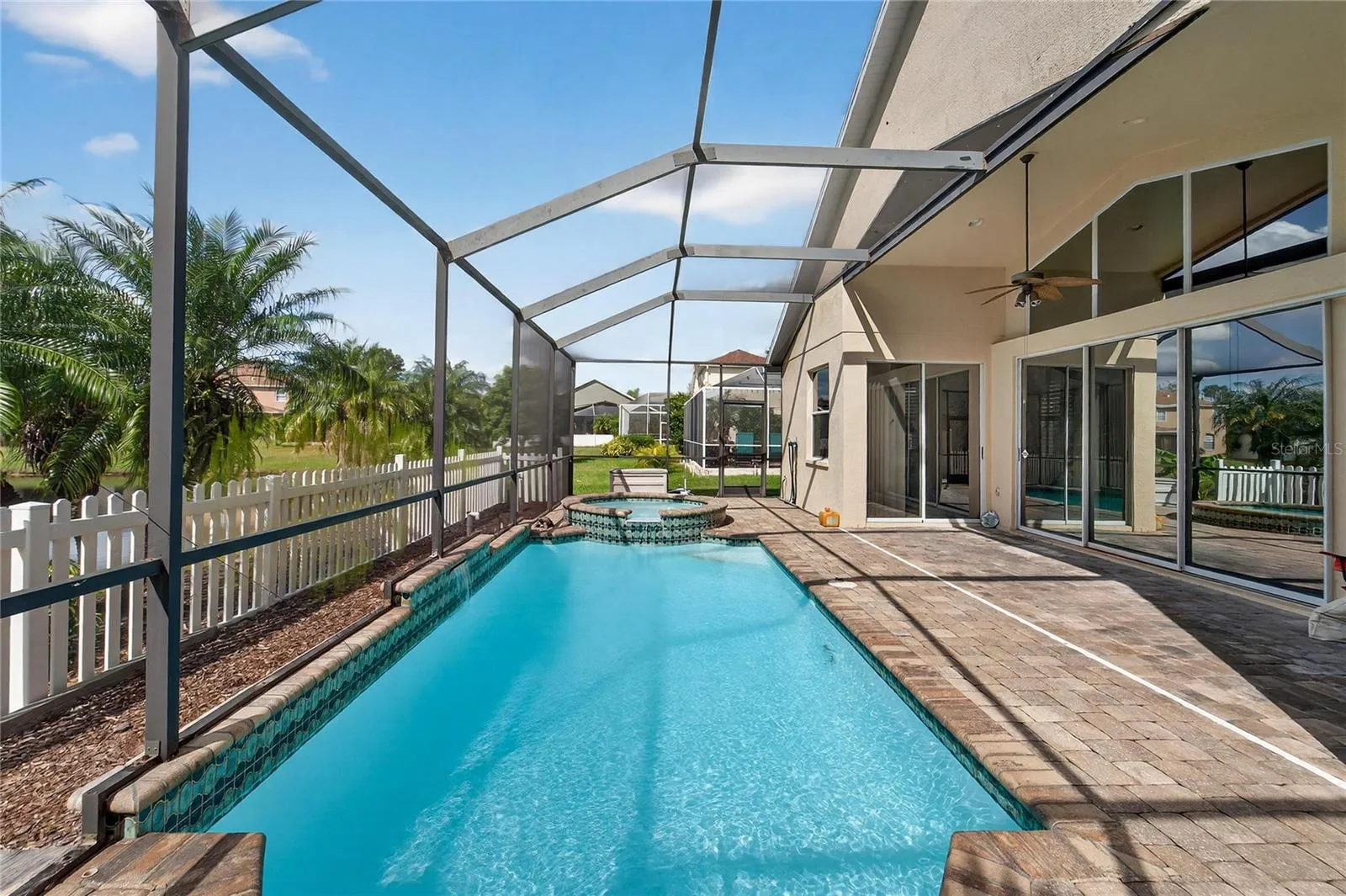 Relax and unwind in your saltwater pool and spa, fully screened under a brick-paved lanai, overlooking serene water views. The fully fenced backyard and brick-paved driveway and walkways add to the home’s curb appeal.