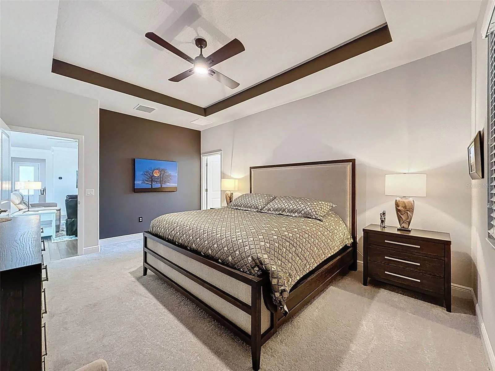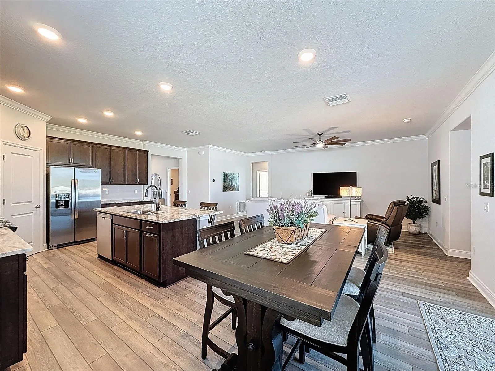 Step inside to discover an inviting ambiance highlighted by tasteful upgrades throughout. The bright and airy living spaces feature recessed lighting, crown molding and generous ceiling height. Luxury vinyl plank flooring flows seamlessly through the living areas, while plush carpeting adds comfort to the bedrooms.