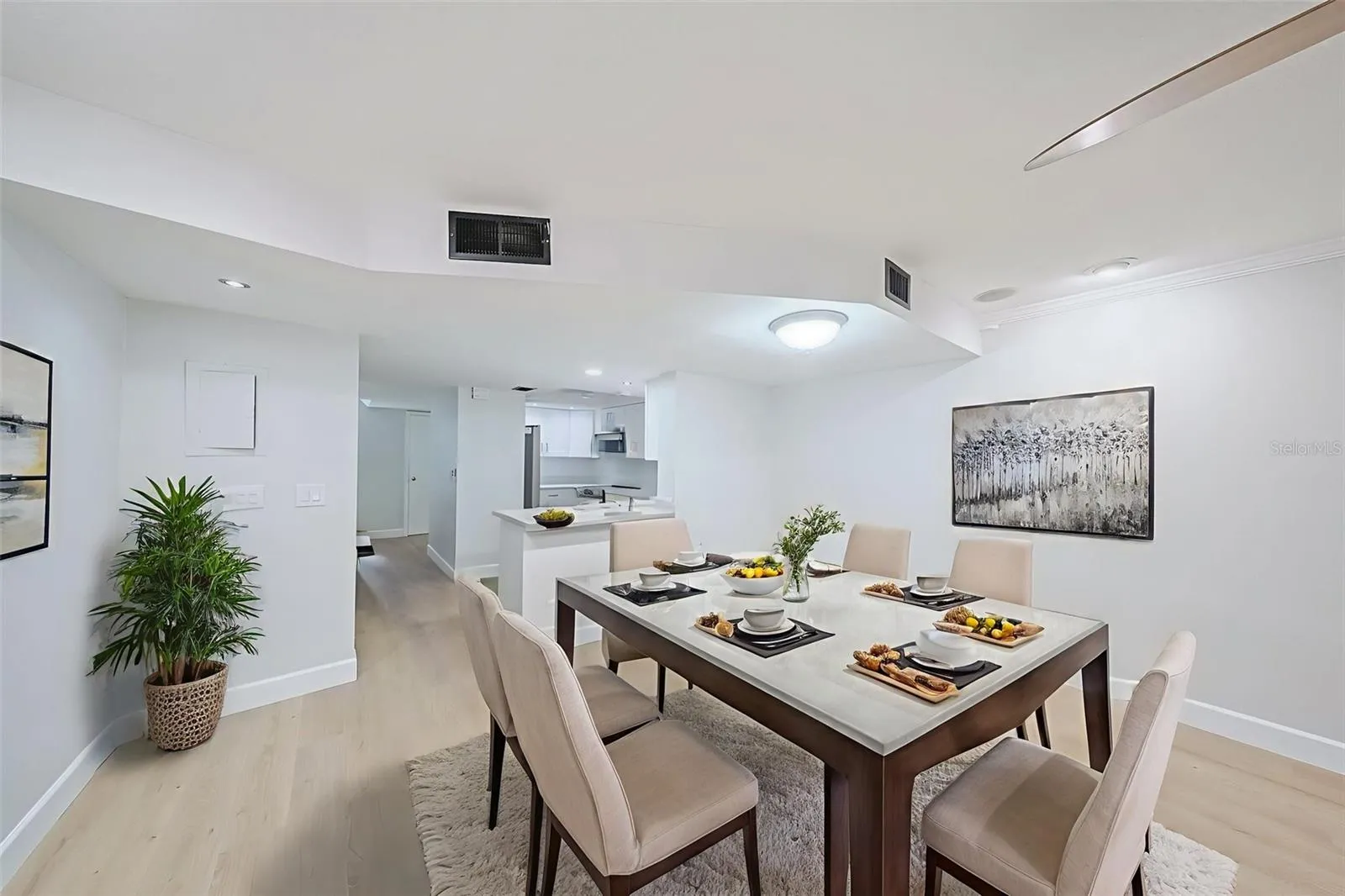 • Open-concept floor plan, with complementing wood laminate flooring throughout the condo, Designer shade of light dove gray, light enhancing fresh paint for entire condo, recessed  daylight lighting looks so bright, airy and inviting.