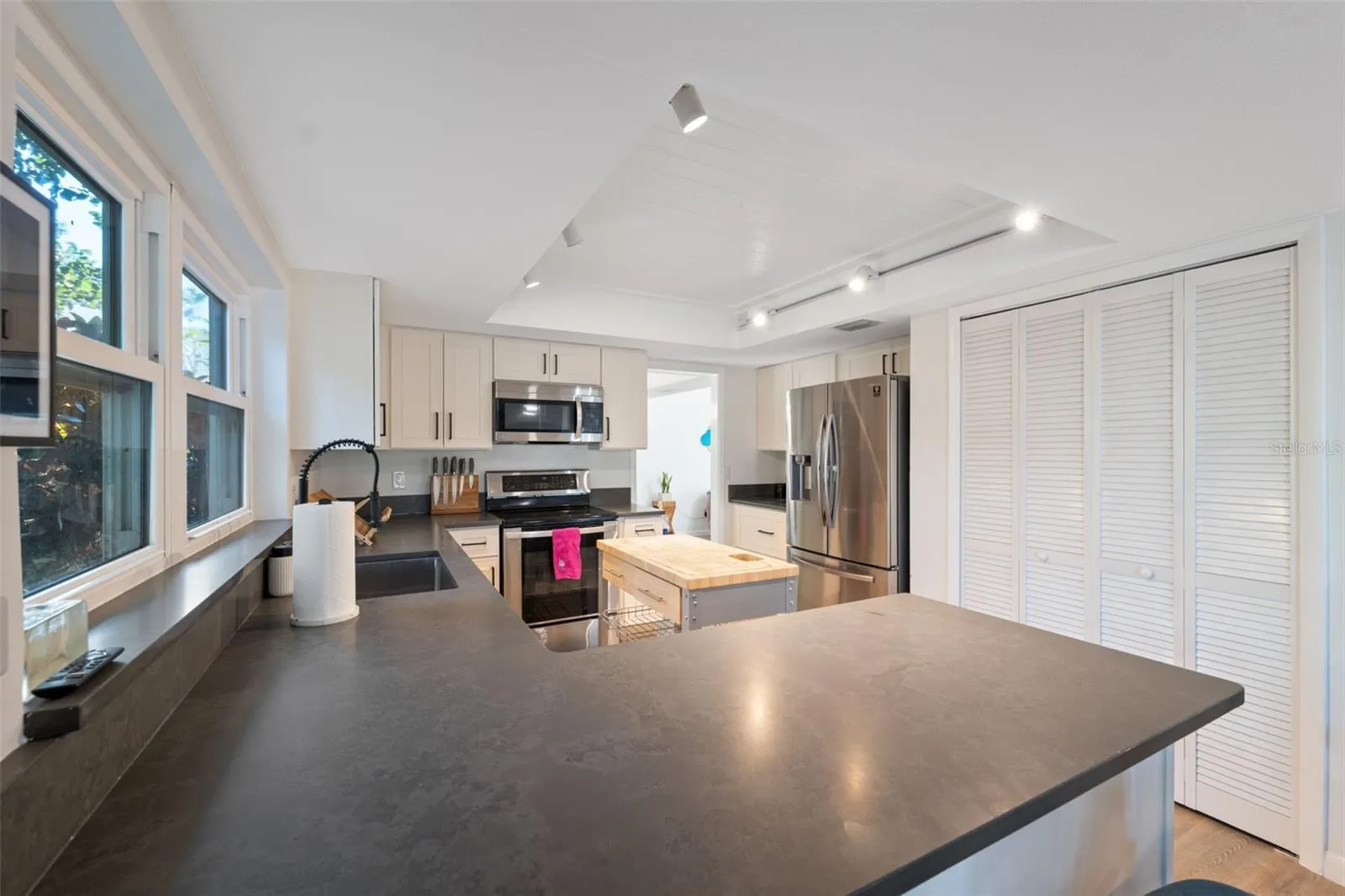 Step inside to discover an open-concept layout featuring luxury vinyl plank flooring (2025) and a remodeled kitchen (2023) with modern appliances, sleek cabinetry, and generous workspace — perfect for home cooks and entertainers alike. The living room’s electric fireplace wall creates a stunning focal point and flows seamlessly to the screen-enclosed pool area, ideal for relaxing or hosting weekend gatherings.