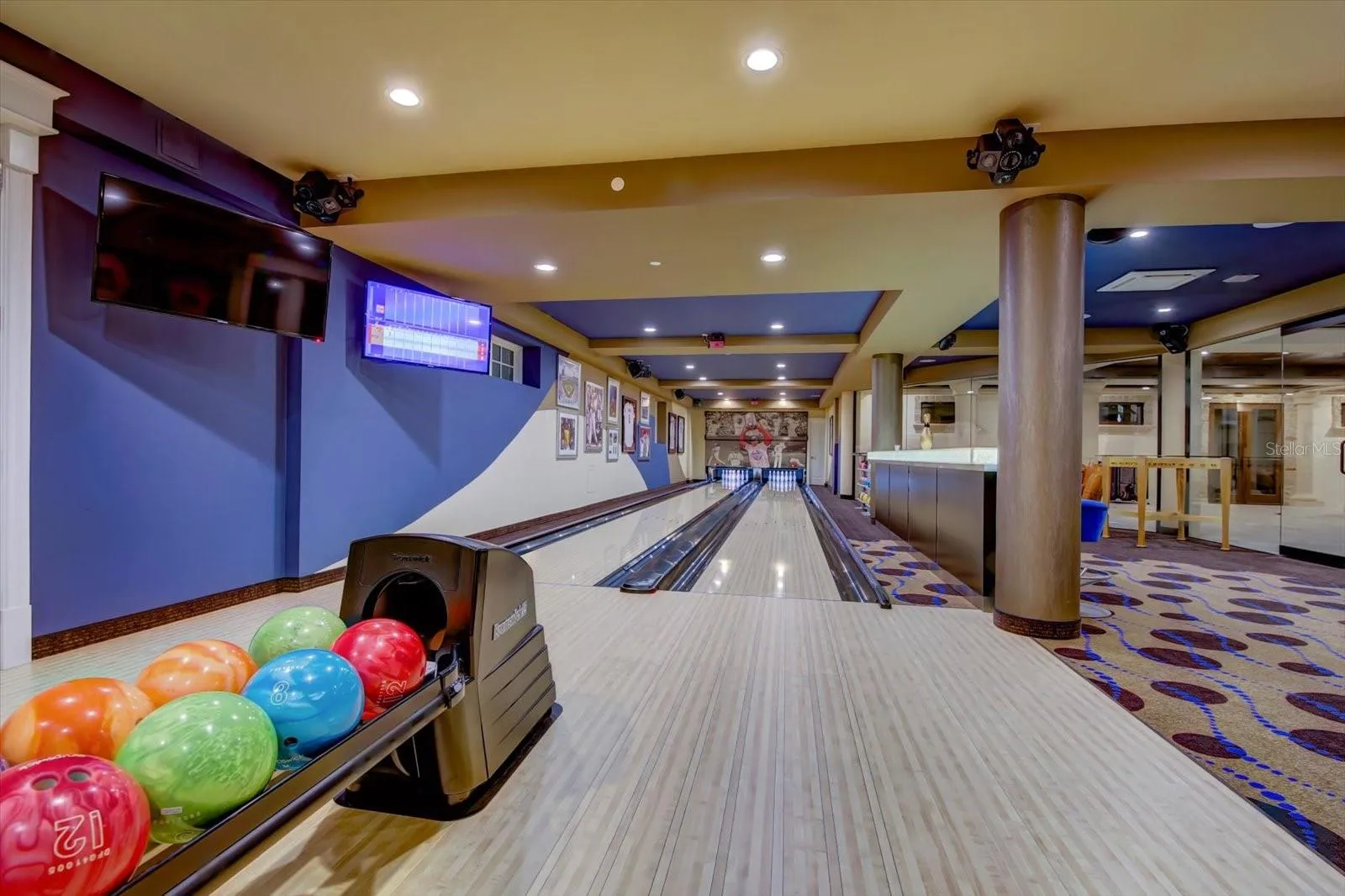 Outdoors, enjoy a spectacular resort-style pool with a lazy river and a fully equipped grill area featuring refrigeration and ice – ideal for entertaining. Inside, discover a bowling alley, adding a unique experience.